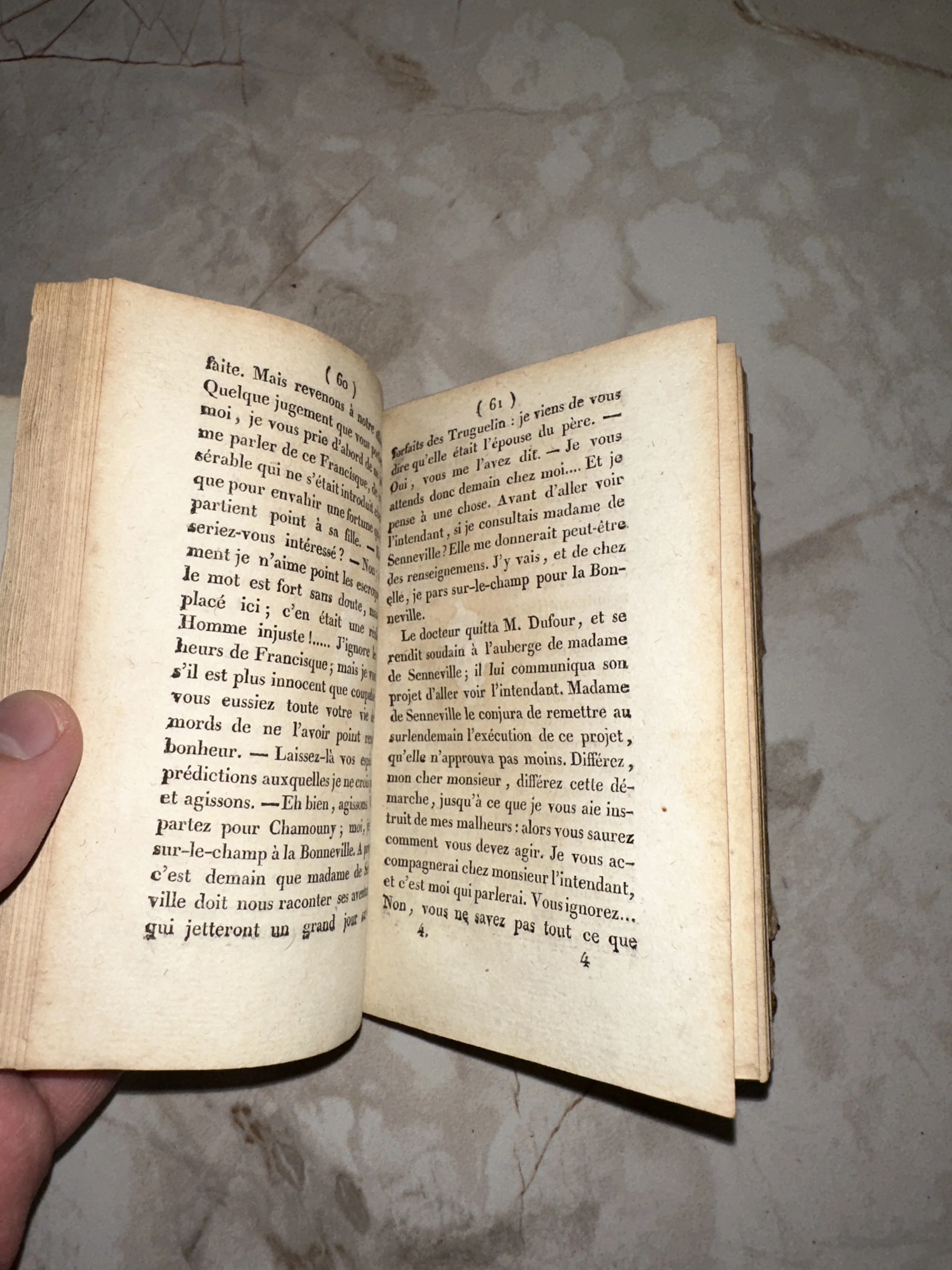 Перед вами подлинный фрагмент истории — разворот старинного издания с характерной благородной патиной на плотной бумаге. Изящный антиквенный шрифт и живой французский слог переносят читателя в атмосферу европейских литературных салонов прошлого. Состояние страниц и сохранность текста делают этот экземпляр ценным приобретением для коллекционеров и любителей редкой книги.