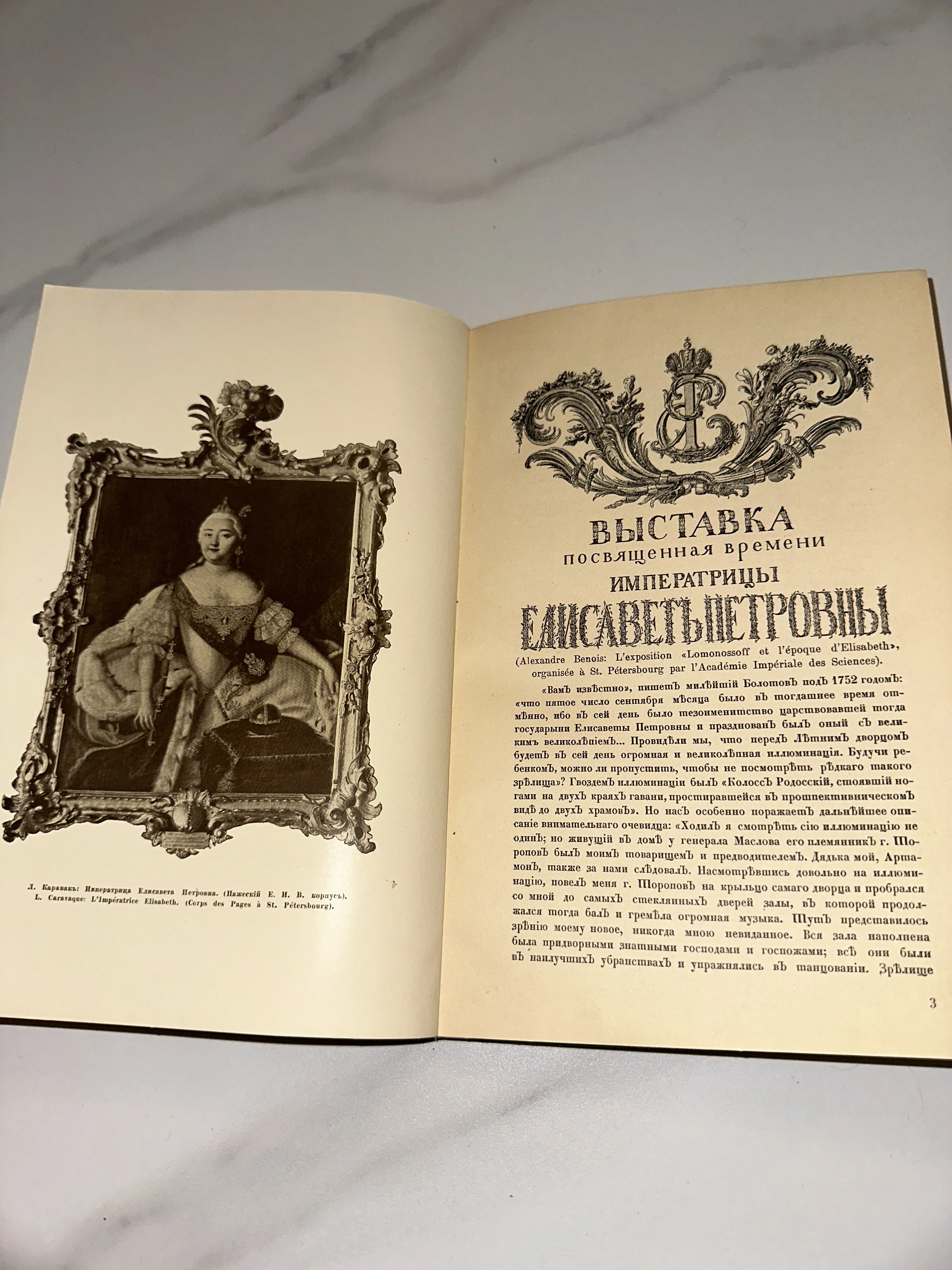 Изысканный разворот дореволюционного издания, посвященного блестящей эпохе Елизаветы Петровны и оформленного при участии Александра Бенуа. На левой странице представлен величественный портрет императрицы в пышной раме, а текст справа погружает в атмосферу празднеств и иллюминаций середины XVIII века. Состояние бумаги подчеркивает благородный возраст предмета, делая его ценным приобретением для ценителей русской истории.