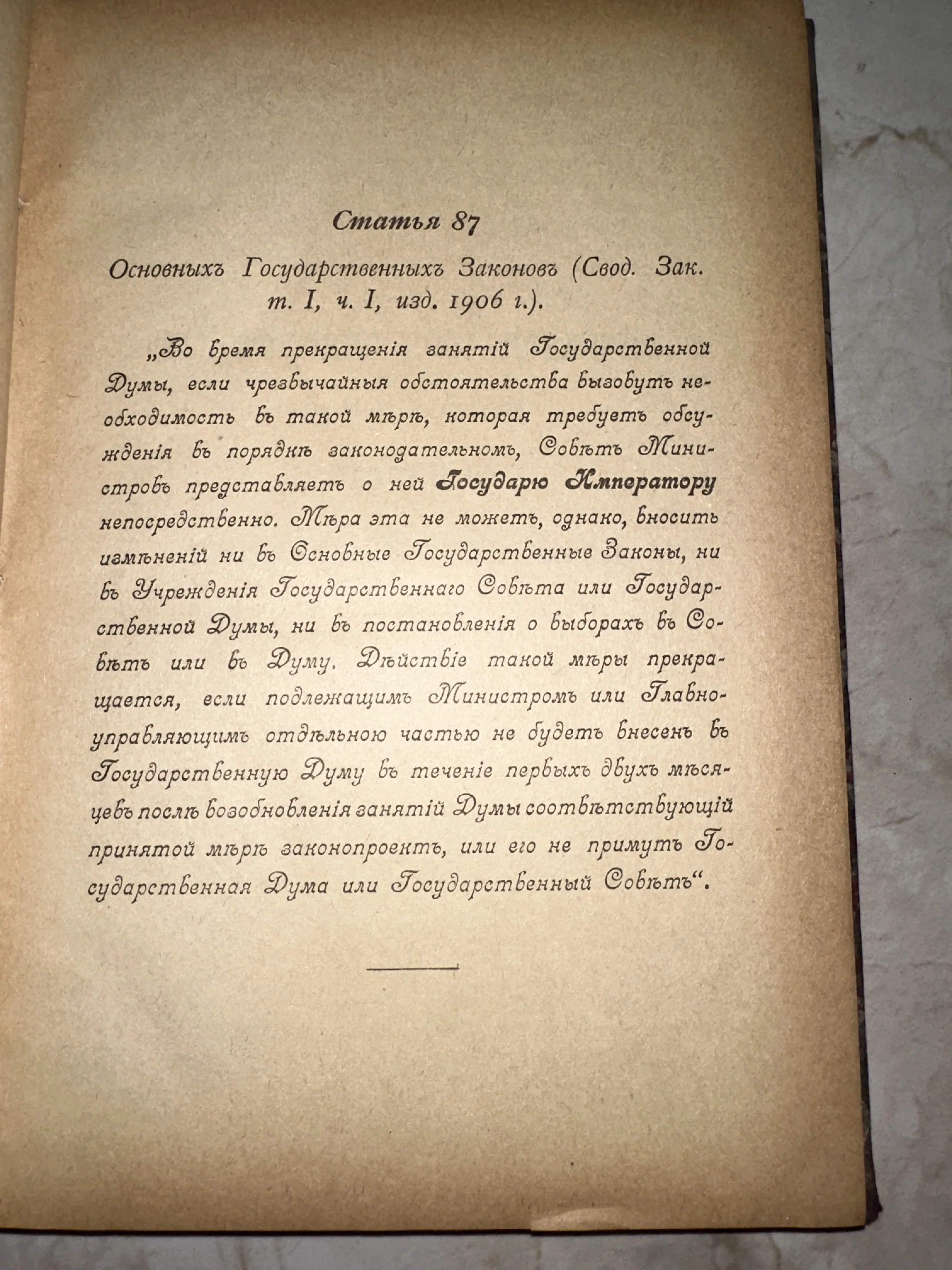 Страница антикварной книги со статьей 87 Основных Государственных Законов издания 1906 года, напечатанная дореволюционным шрифтом на пожелтевшей бумаге.