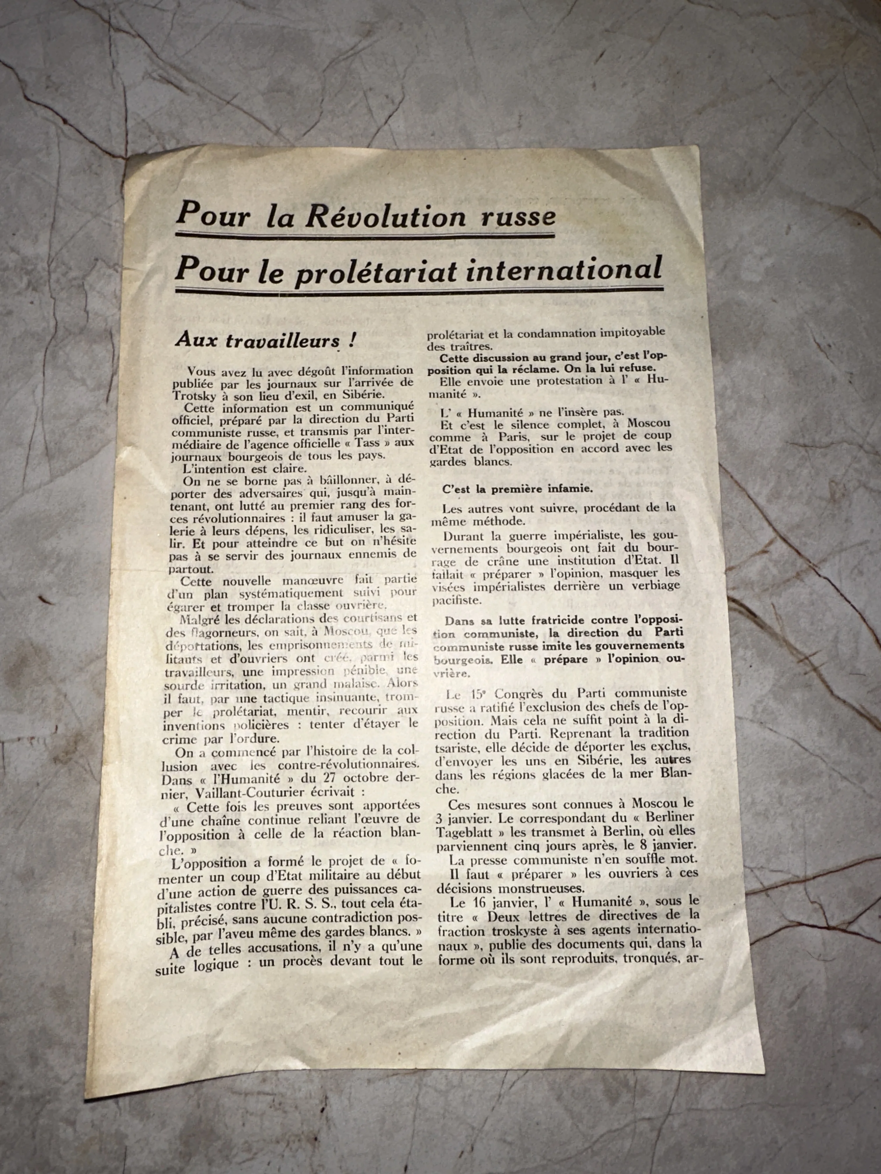 Редкий артефакт политической борьбы начала XX века, призывающий к поддержке русской революции и защите интересов международного пролетариата. Текст листовки затрагивает вопросы ссылки Льва Троцкого и внутренние конфликты в коммунистической партии, передавая напряженную атмосферу эпохи. Бумага имеет благородные следы времени, что подтверждает её аутентичность и историческую ценность для коллекционеров политической эпифемеры.