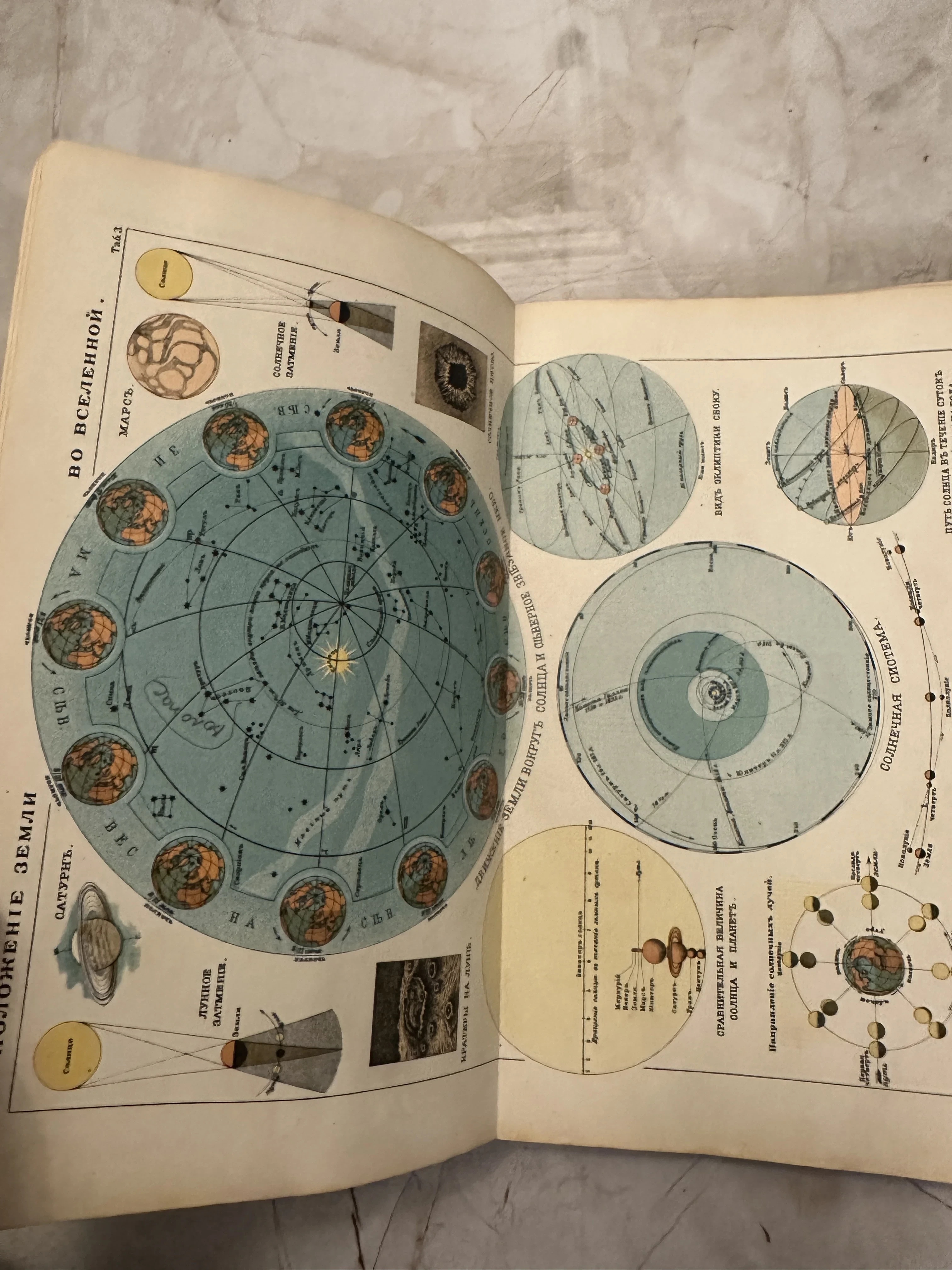 Разворот старинной книги с цветными литографиями, изображающими движение Земли вокруг Солнца, фазы Луны и планеты Солнечной системы.