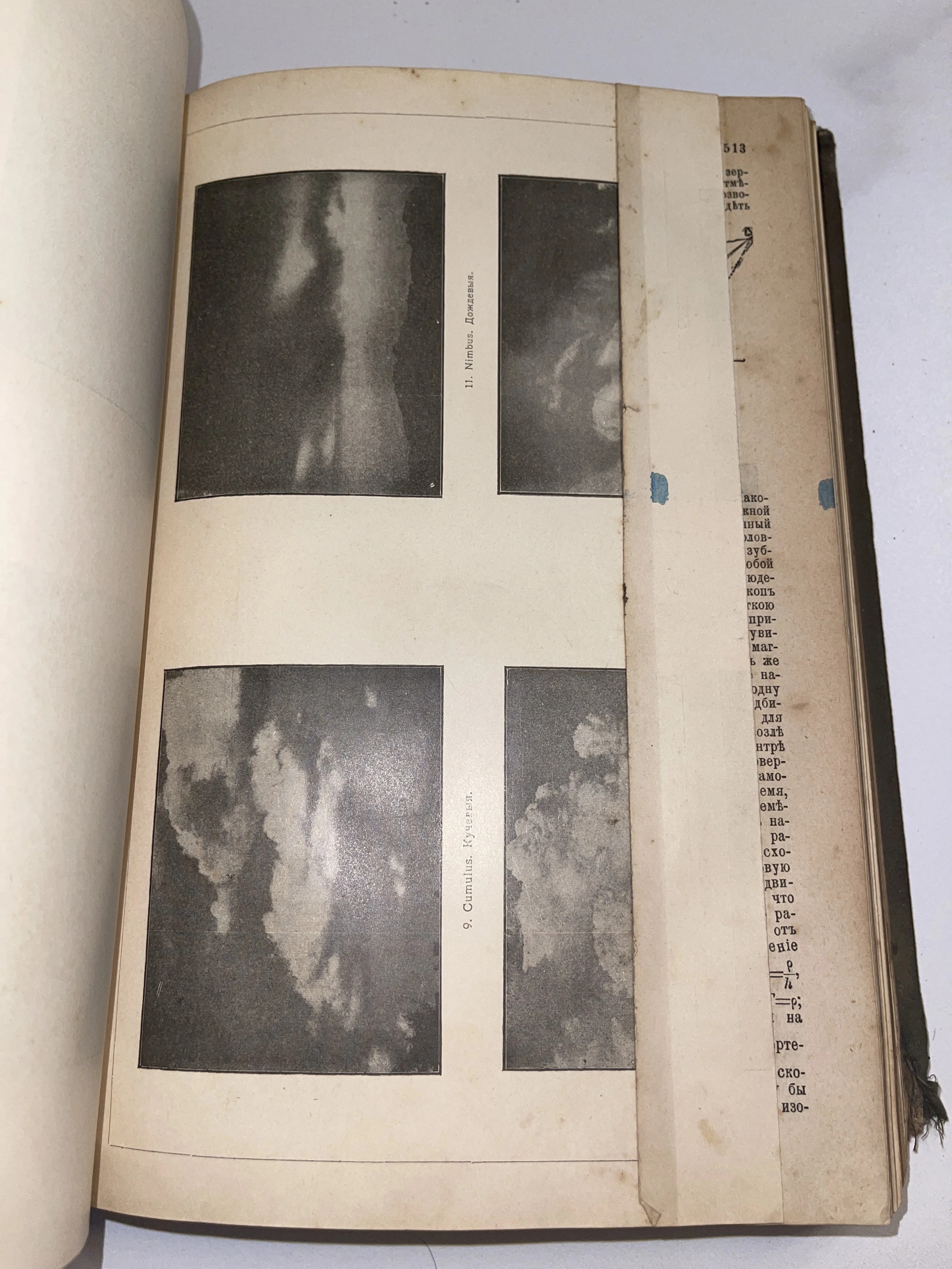 Уникальный фрагмент дореволюционного научного труда, представляющий ранние метеорологические наблюдения в фотографиях. На пожелтевших страницах запечатлены формы дождевых и кучевых облаков, сохранившие строгую эстетику науки рубежа XIX–XX веков. Редкий экземпляр, передающий атмосферу кабинетных исследований и подлинную историю естествознания.