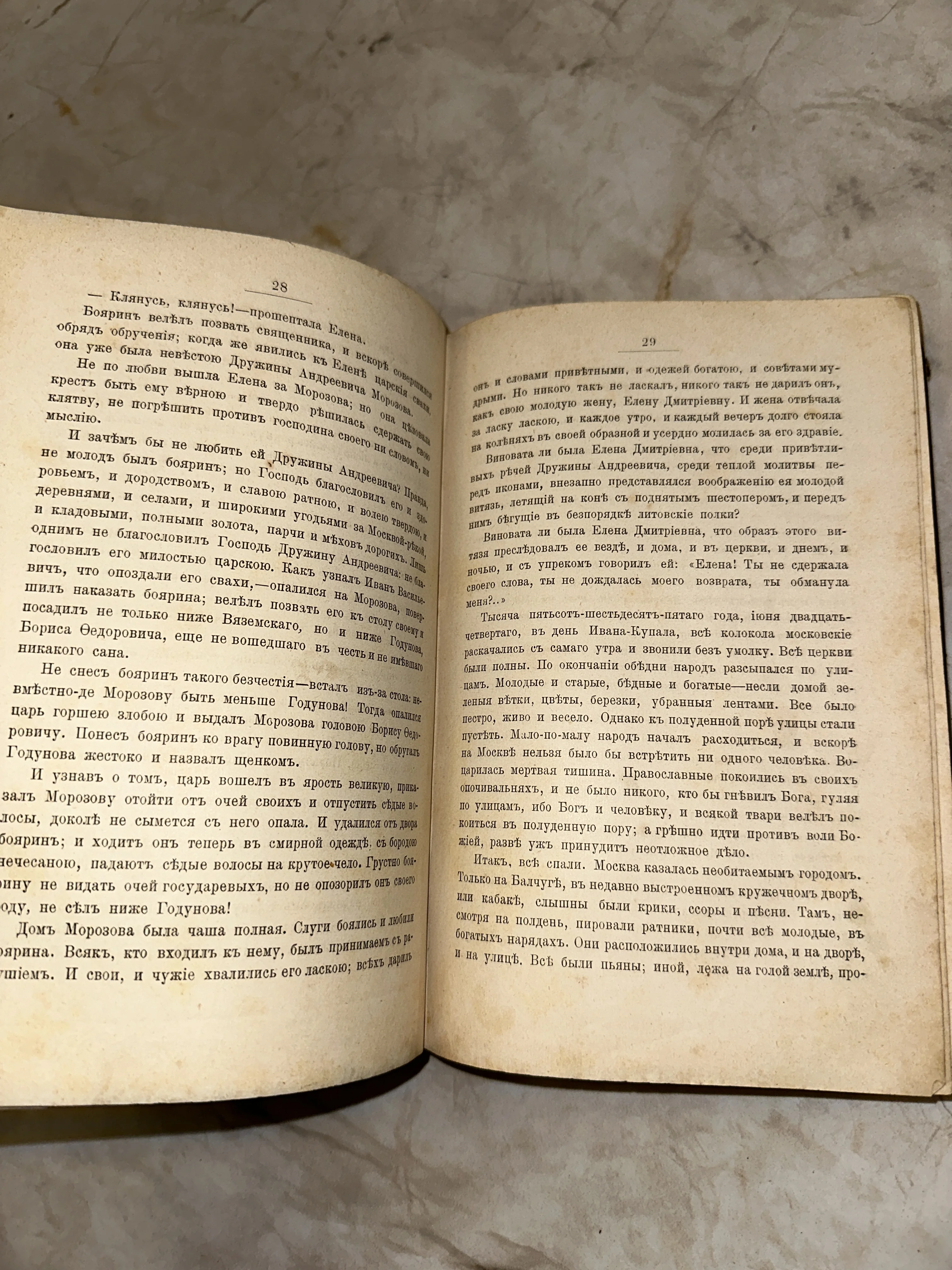 Погрузитесь в атмосферу эпохи Ивана Грозного через строки классического повествования, напечатанные изящным шрифтом с использованием «ятей» и «еров». Пожелтевшая от времени бумага и благородная патина старины подчеркивают историческую ценность этого экземпляра. Текст сохранил четкость типографской печати, передавая дух русской литературы прошлых столетий.