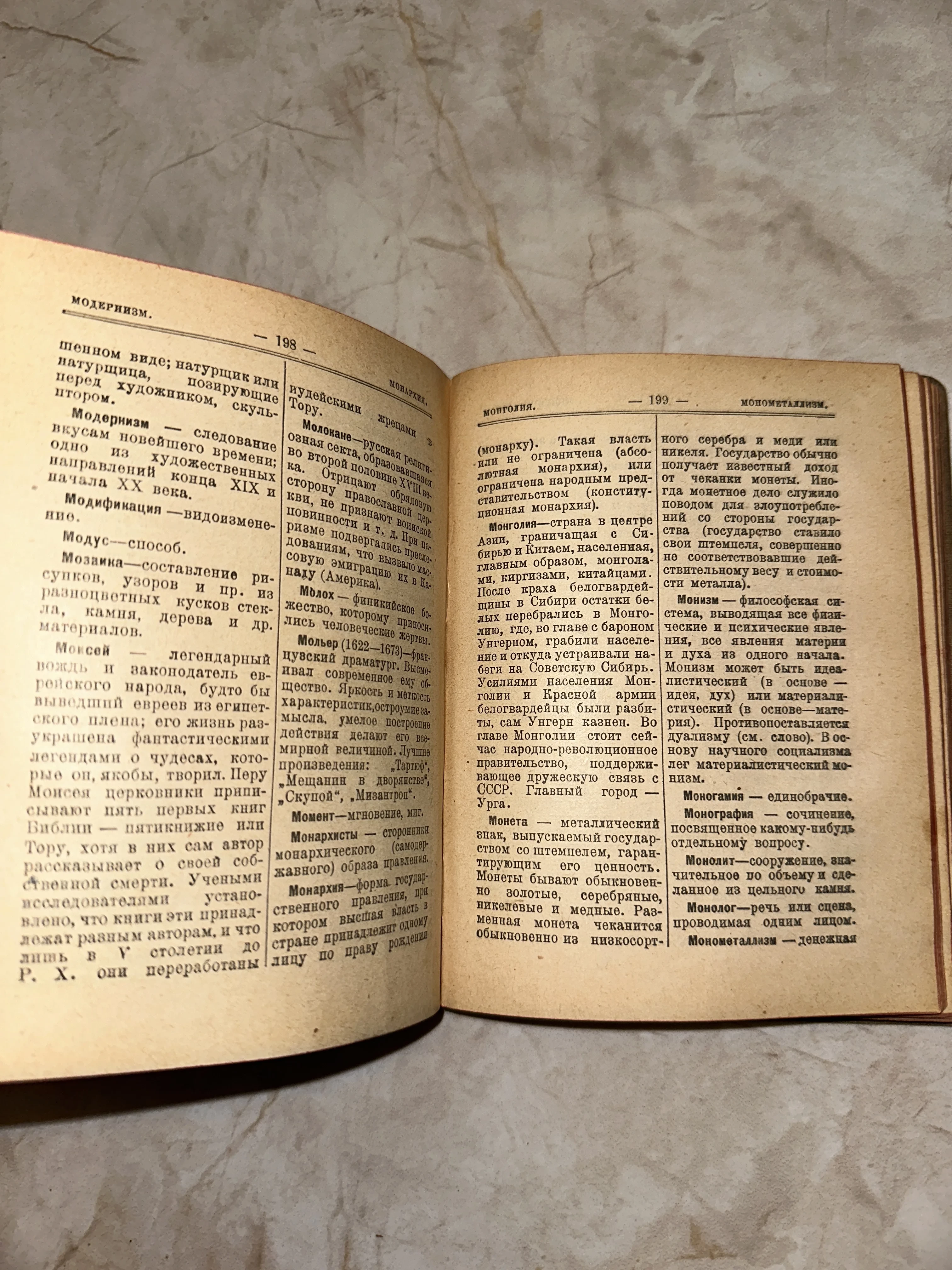 Перед вами аутентичный разворот энциклопедического издания начала XX века с характерной версткой и шрифтом той эпохи. Пожелтевшая от времени бумага и четкие оттиски статей о модернизме и истории Монголии создают неповторимую атмосферу интеллектуального наследия. Издание сохранилось в хорошем состоянии, что делает его ценным артефактом для частной коллекции или декоративного оформления.