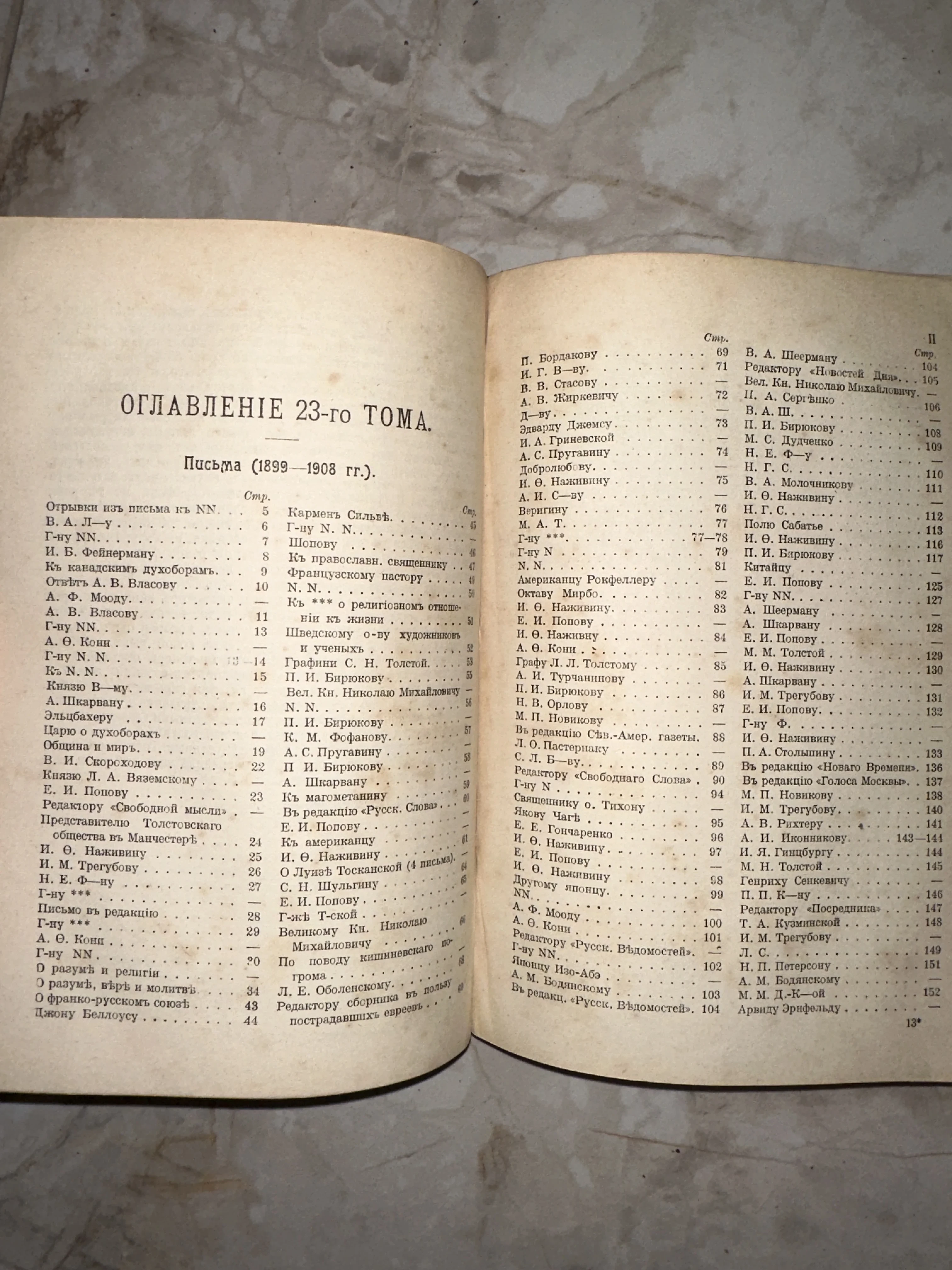 Этот редкий разворот представляет собой подробный перечень переписки великого классика с выдающимися личностями рубежа веков. Пожелтевшие страницы с дореволюционной орфографией и четкой типографикой передают атмосферу интеллектуальной жизни начала XX столетия. Настоящая находка для коллекционера, ценящего подлинную букинистику и историческую значимость документов.