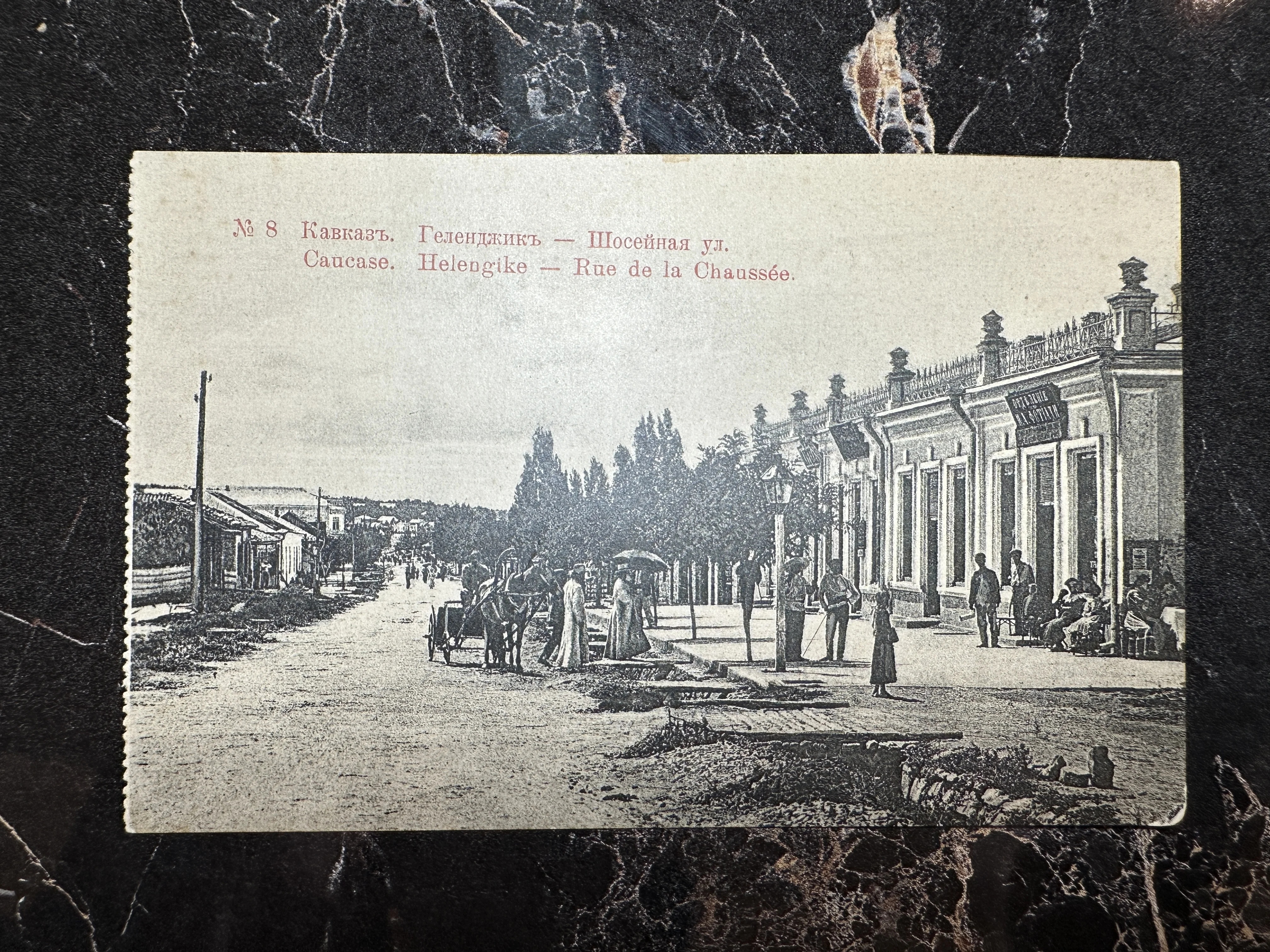 Эта редкая дореволюционная открытка переносит нас в атмосферу курортного Геленджика начала прошлого столетия. На снимке детально запечатлена архитектура Шоссейной улицы, прогуливающиеся горожане и традиционный конный экипаж. Коллекционный экземпляр с характерными зубчатыми краями сохранил великолепную четкость и станет жемчужиной в собрании видов Кавказа.