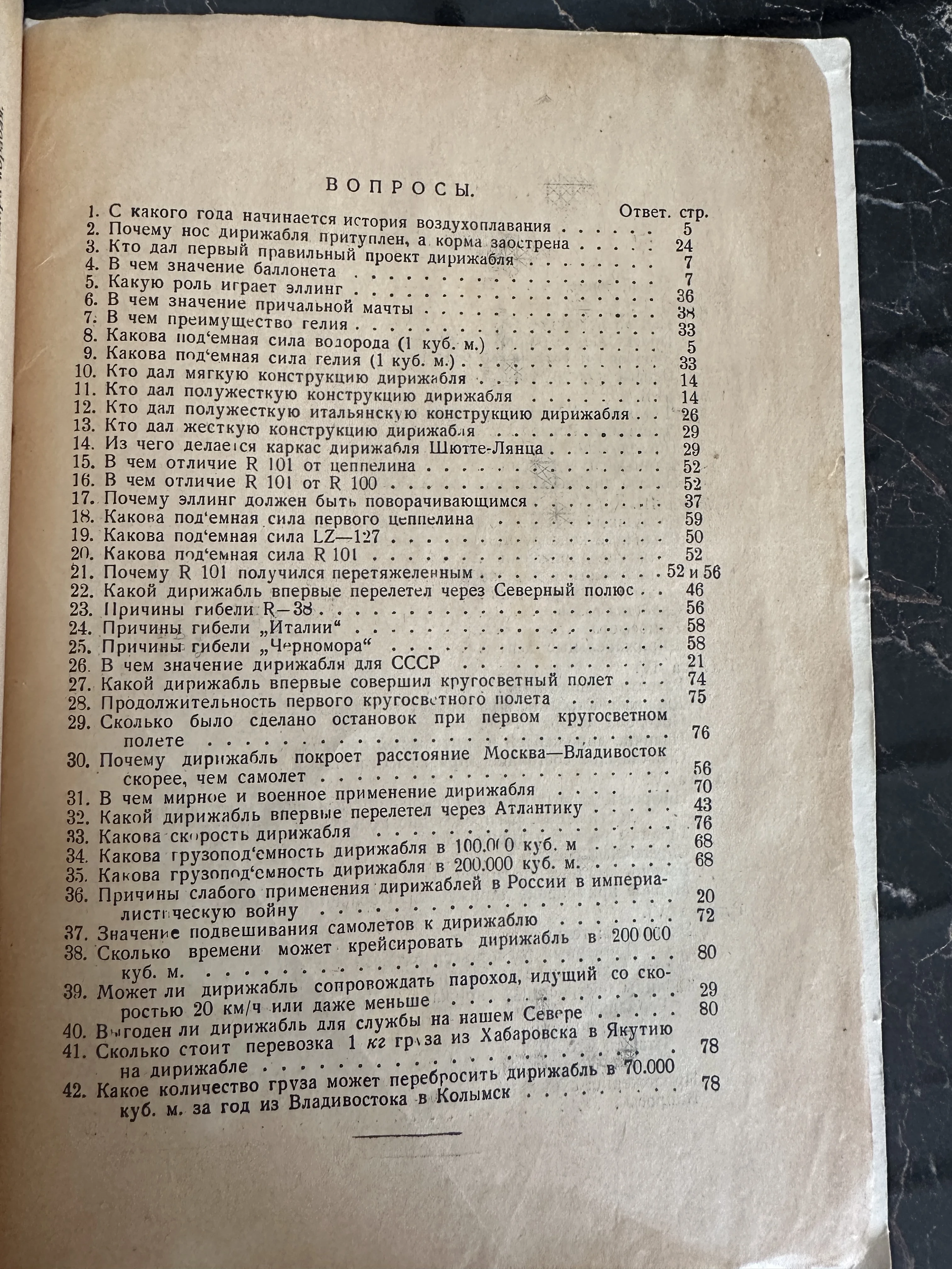 Старинная книжная страница со списком из 42 вопросов об истории и устройстве дирижаблей.