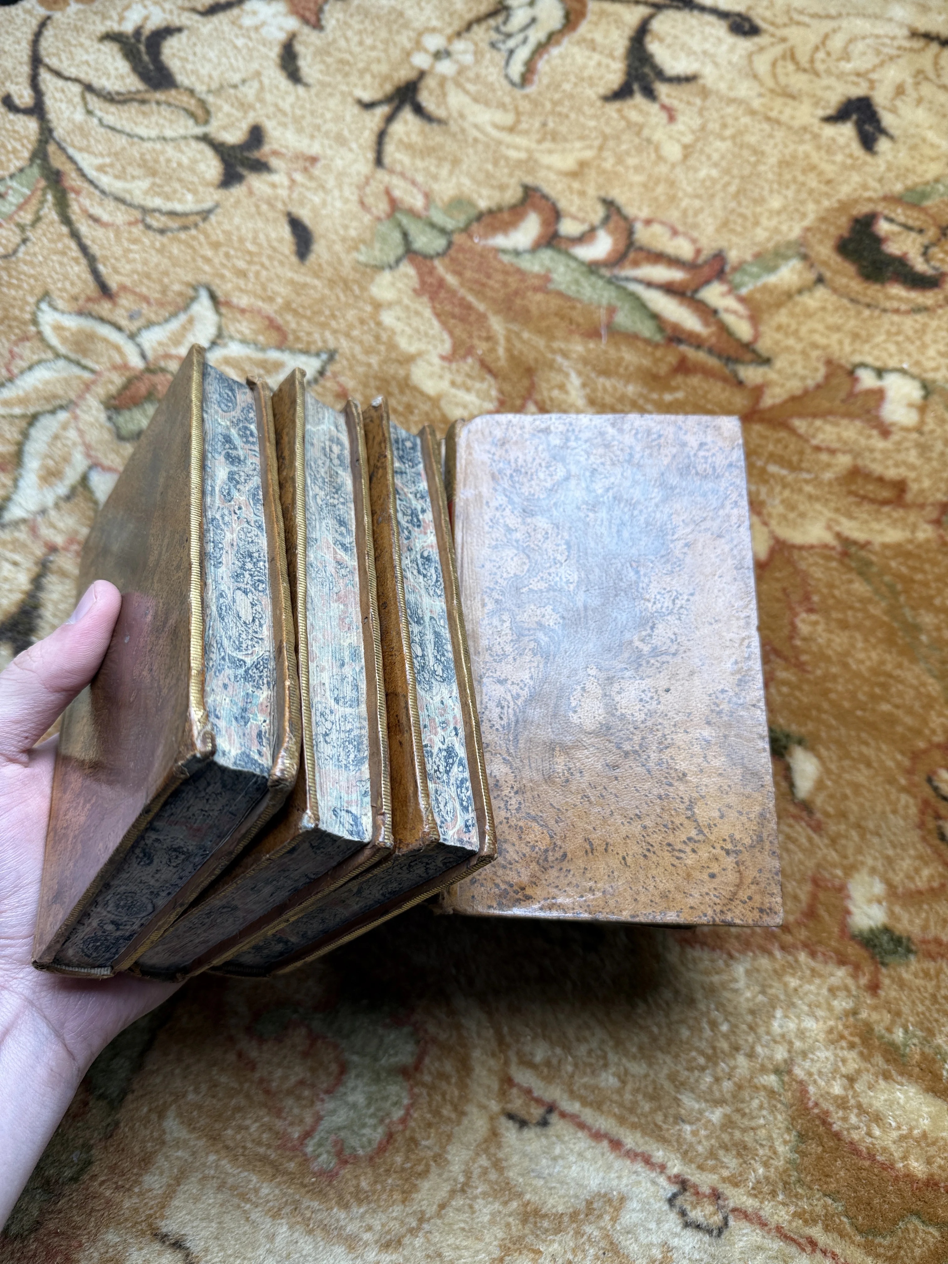 Изысканный комплект миниатюрных изданий, облаченных в классические кожаные переплеты с благородной патиной времени. Особое очарование томам придает декоративный мраморный обрез и тонкое золотое тиснение на кантах, характерное для книжного мастерства прошлых столетий. Эти книги станут великолепным дополнением к интерьеру кабинета или ценным пополнением частного собрания редких фолиантов.