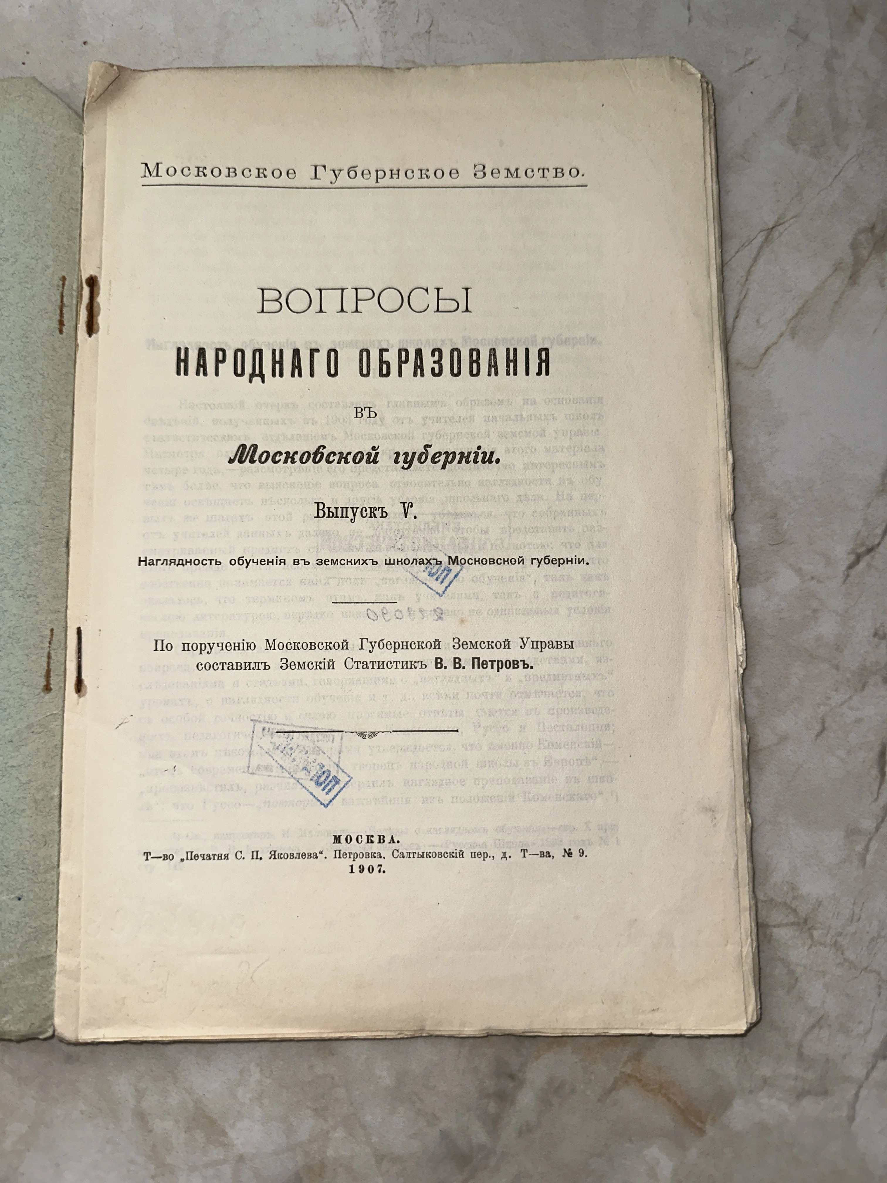 Титульный лист антикварного издания 1907 года «Вопросы народного образования в Московской губернии» с дореволюционной орфографией и архивными штампами.