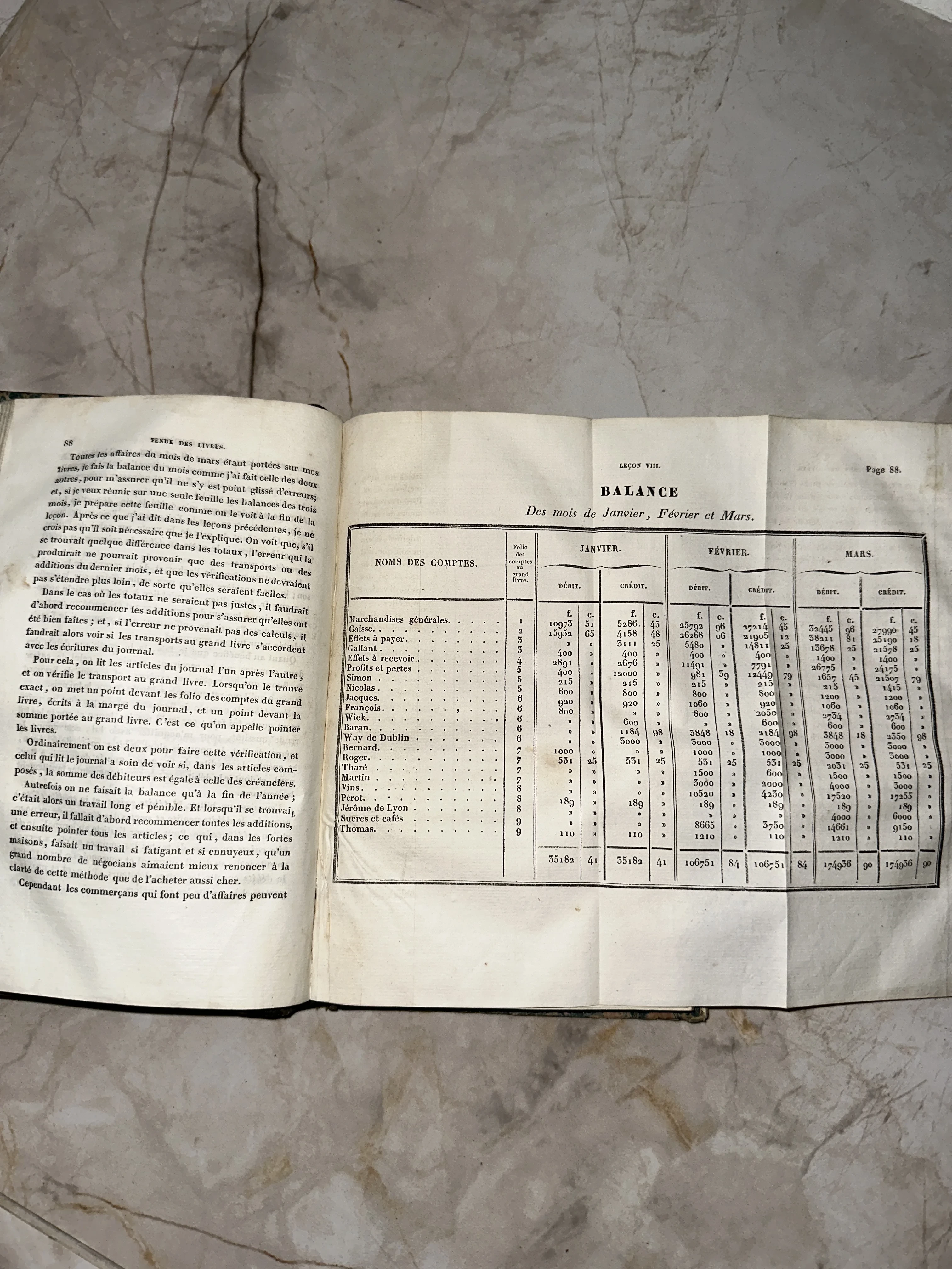 Разворот антикварной книги на французском языке с таблицей финансового баланса за три месяца.