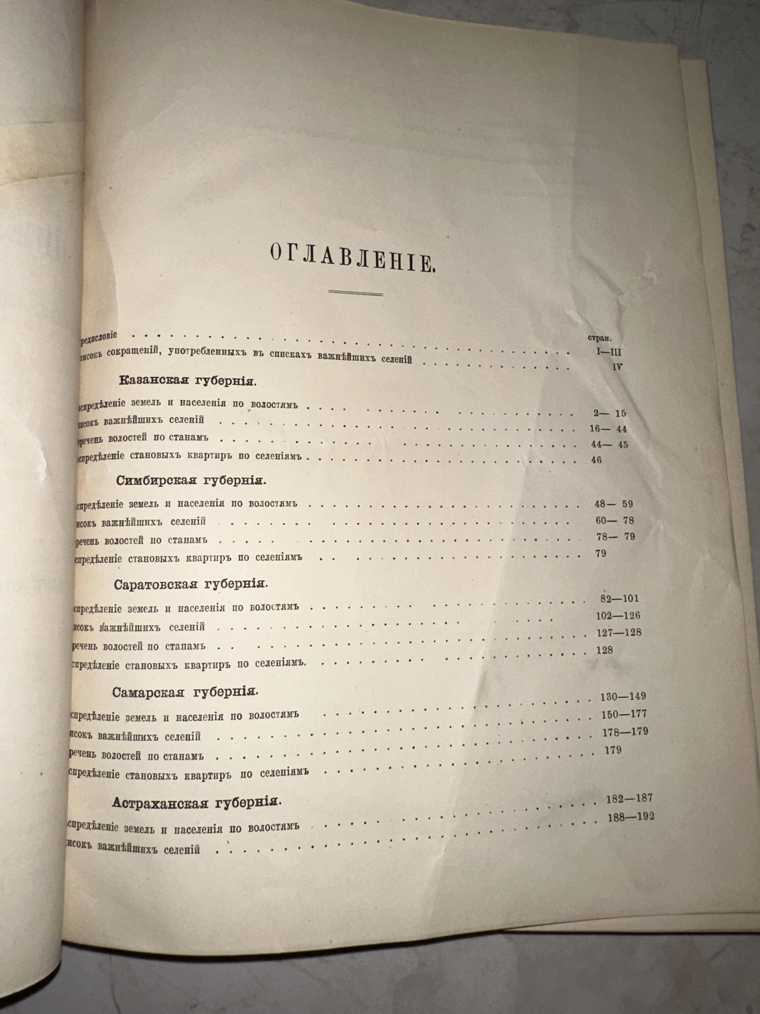 Оглавление старинного статистического издания по губерниям Поволжья