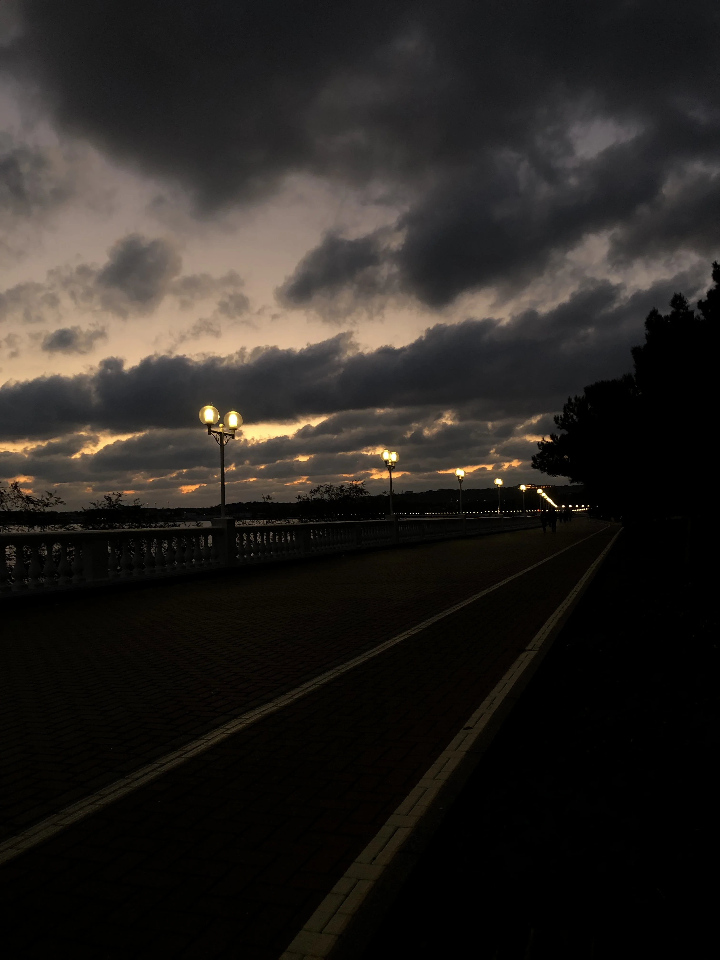 Атмосферный снимок запечатлел мгновение перехода дня в ночь, когда теплый свет фонарей начинает спорить с тяжелым, фактурным небом. Глубокие тени и золотистые просветы на горизонте создают меланхоличное и притягательное настроение прибрежной прогулки. Кадр безупречно передает эстетику вечернего города и спокойствие морского воздуха.