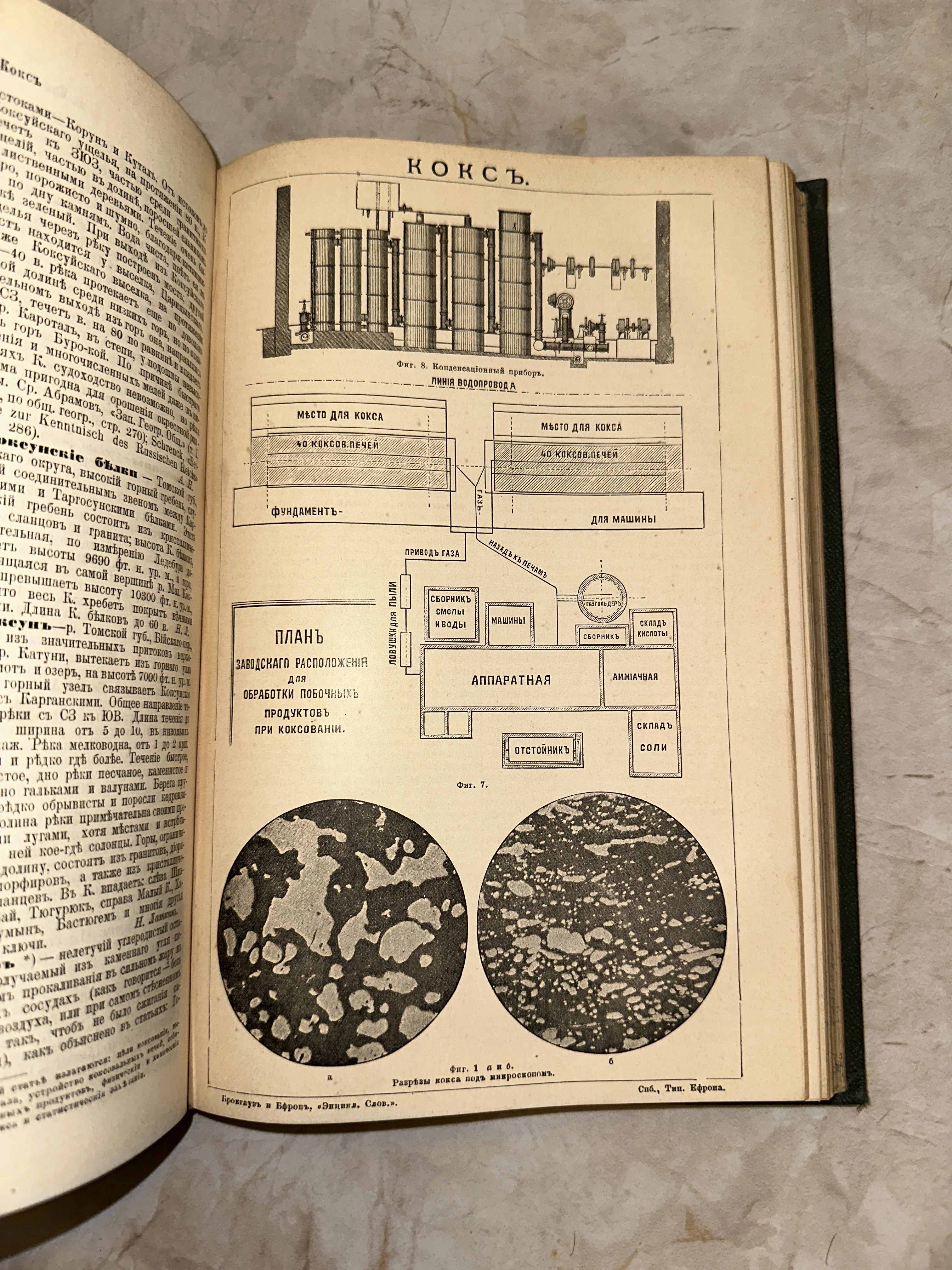 Аутентичный разворот из легендарного энциклопедического словаря Брокгауза и Ефрона, посвященный индустриальным технологиям прошлого. На странице представлены детальные схемы конденсационных приборов и уникальные микроскопические срезы кокса, выполненные в классической технике печати конца XIX века. Благородная патина времени на бумаге подчеркивает историческую значимость этого документа эпохи промышленной революции.