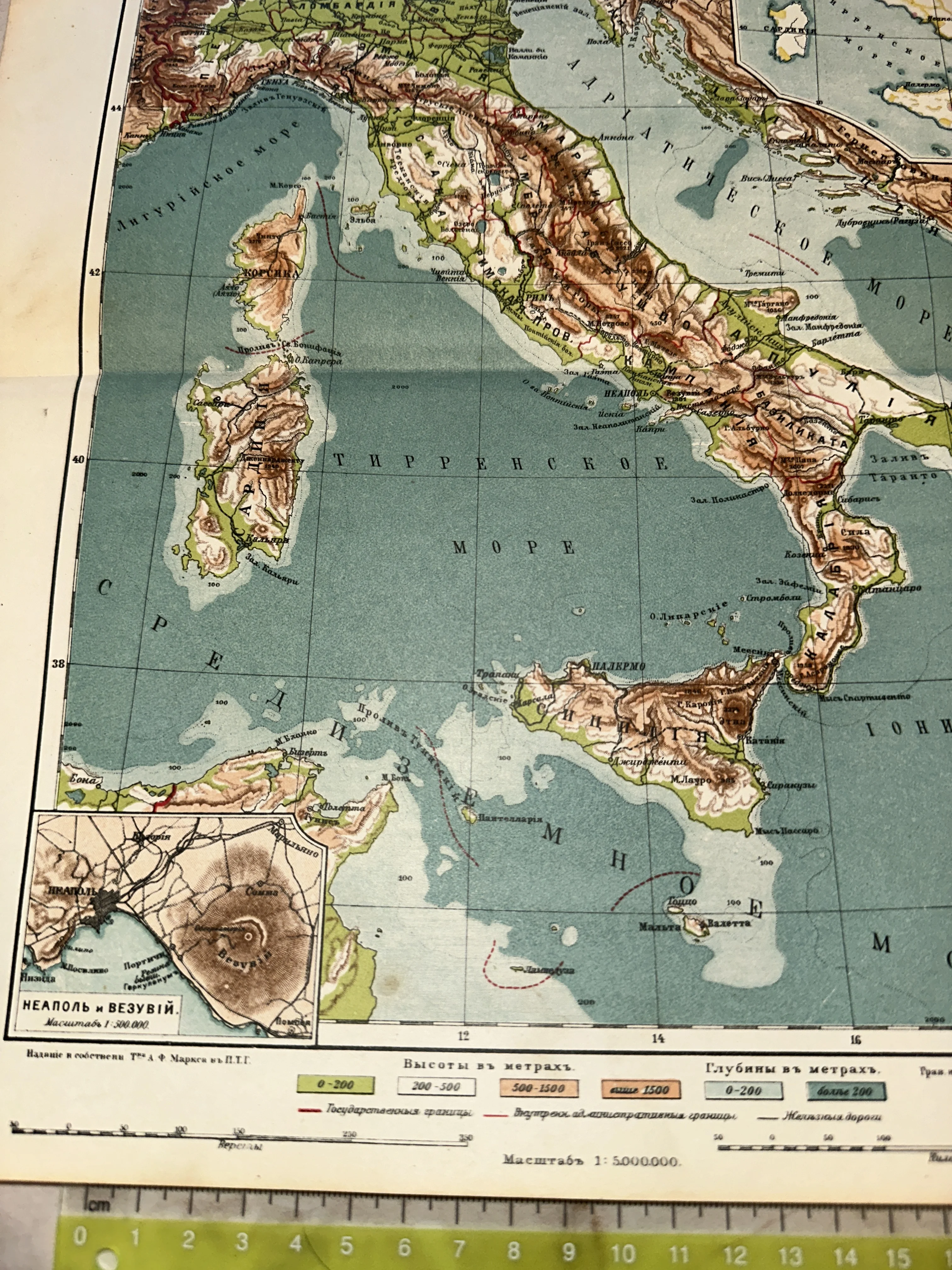 Изысканный образец картографии начала XX века от знаменитого издательства А. Ф. Маркса, отличающийся детальной прорисовкой горного рельефа и береговой линии. Карта исполнена в дореволюционной орфографии и снабжена подробной легендой высот и глубин, а также уникальной вставкой с планом Неаполя и вулкана Везувий. Прекрасное состояние бумаги и насыщенная цветовая гамма делают этот экземпляр ценным дополнением к коллекции или элегантным элементом интерьера.