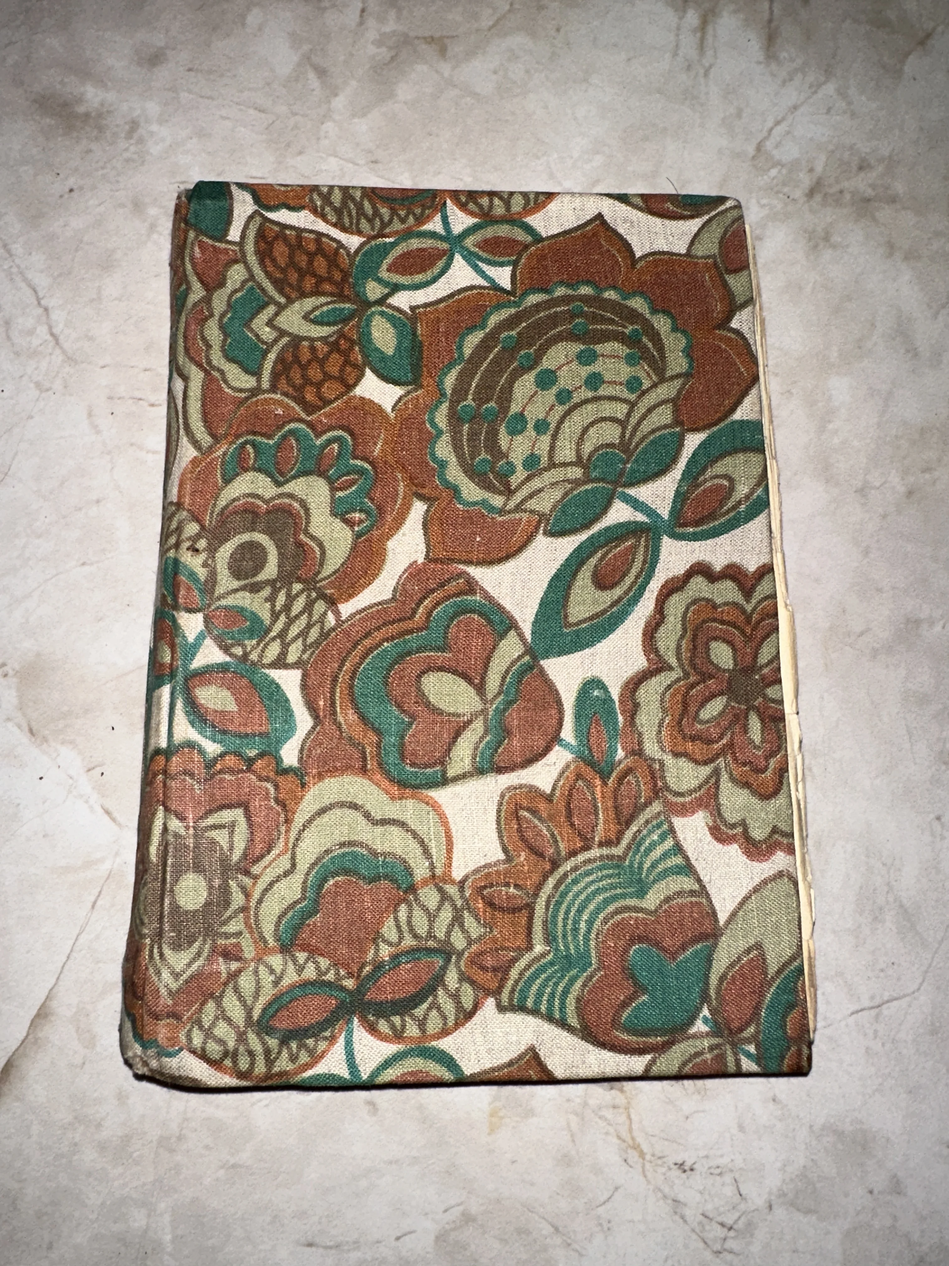 Изящный образец книжного дела с уникальным текстильным оформлением, сохранившим тепло и эстетику прошлых десятилетий. Крупный растительный орнамент в земляных тонах создает атмосферу уютного ретро и подчеркивает индивидуальность издания. Тканевое покрытие имеет благородную фактуру и находится в хорошей сохранности, что делает предмет ценным дополнением винтажной коллекции.
