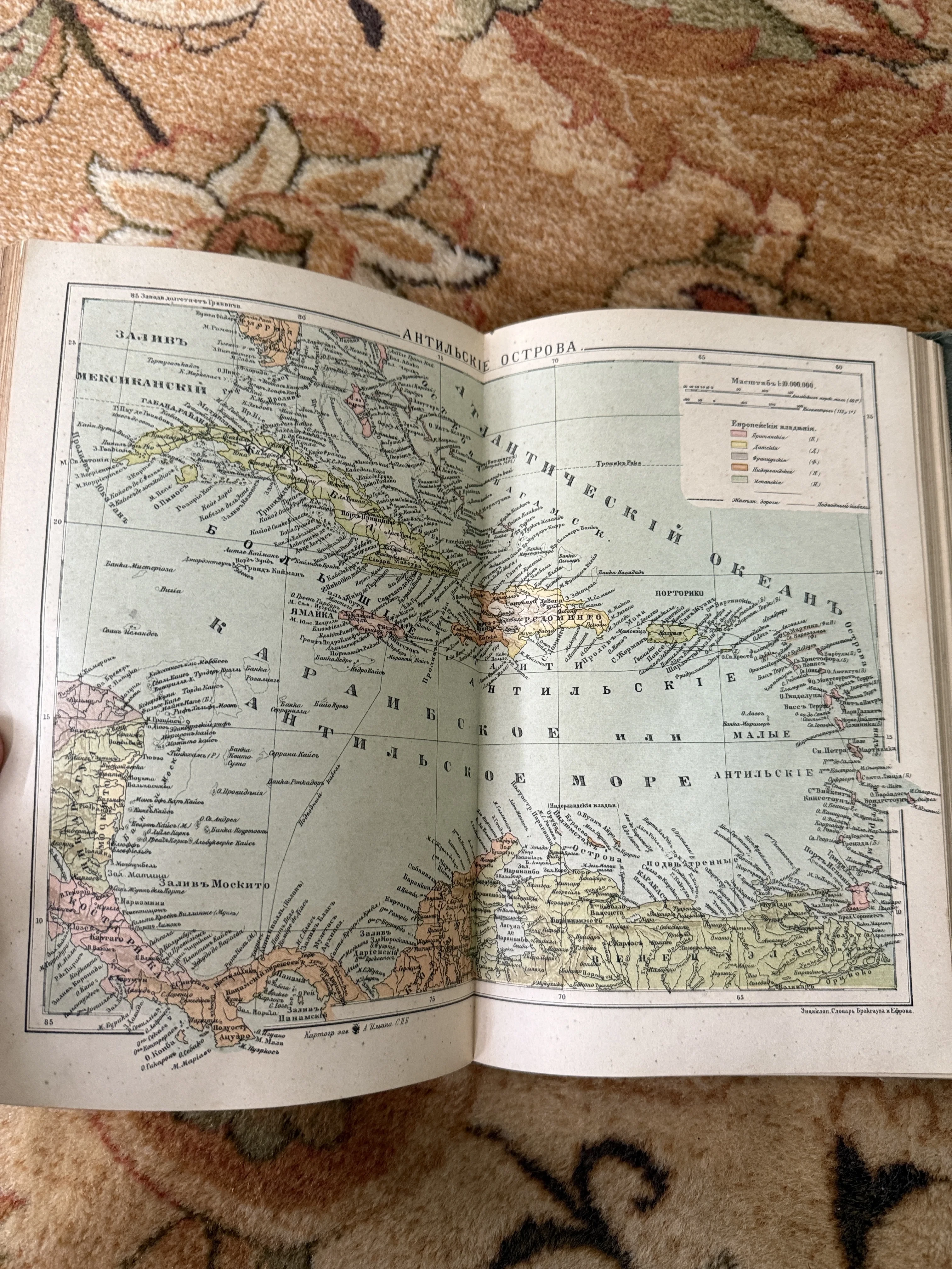 Разворот антикварной книги с цветной литографированной картой Карибского моря и Антильских островов на русском языке.