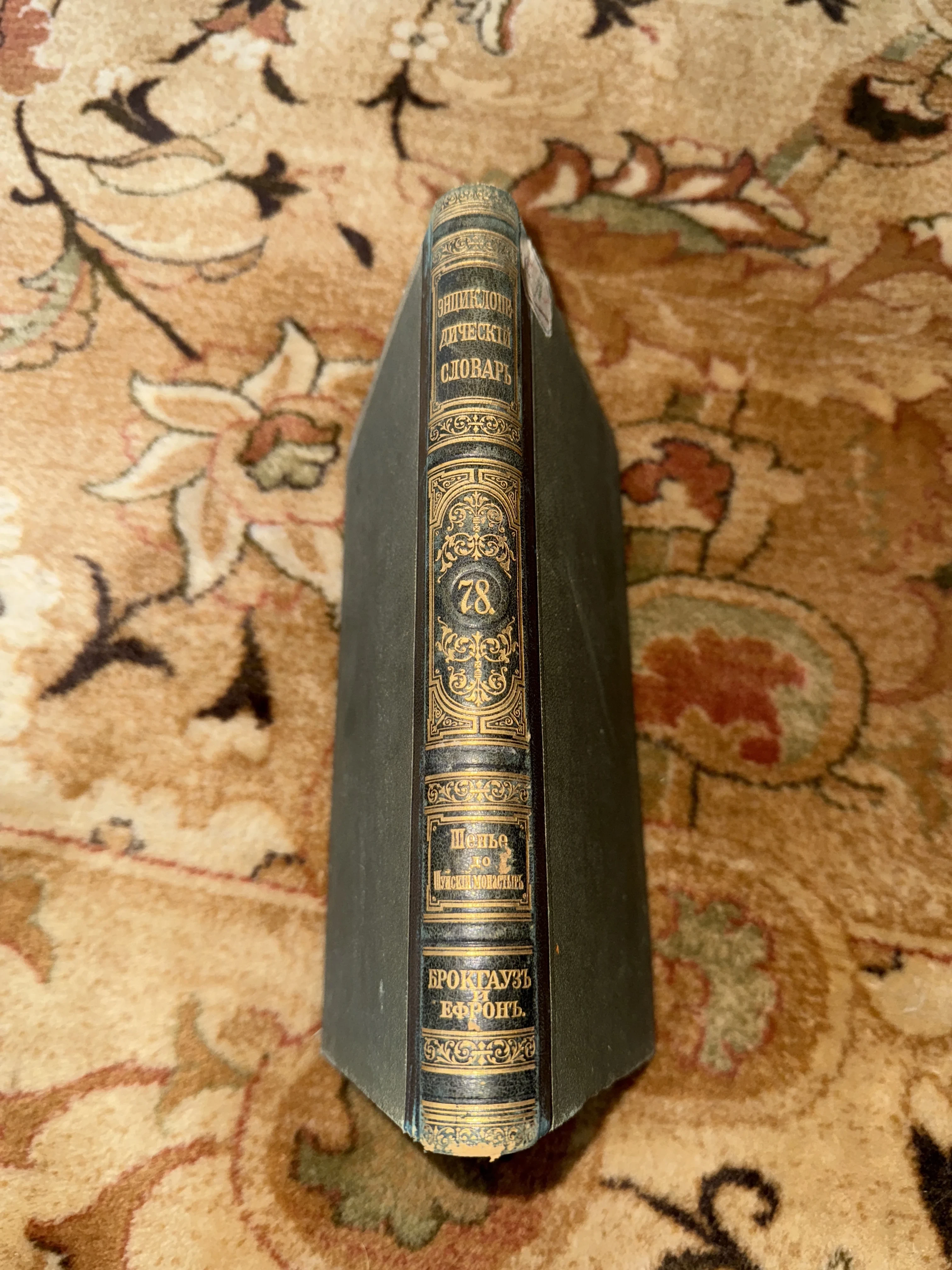 Перед вами подлинный образец книжного искусства конца XIX века — легендарный энциклопедический словарь Брокгауза и Ефрона. Изящное золотое тиснение на массивном корешке и благородная патина времени делают этот фолиант не только ценным историческим источником, но и великолепным украшением классического интерьера. Этот том, охватывающий темы от Шелье до Шуйского монастыря, станет жемчужиной в коллекции любого библиофила.