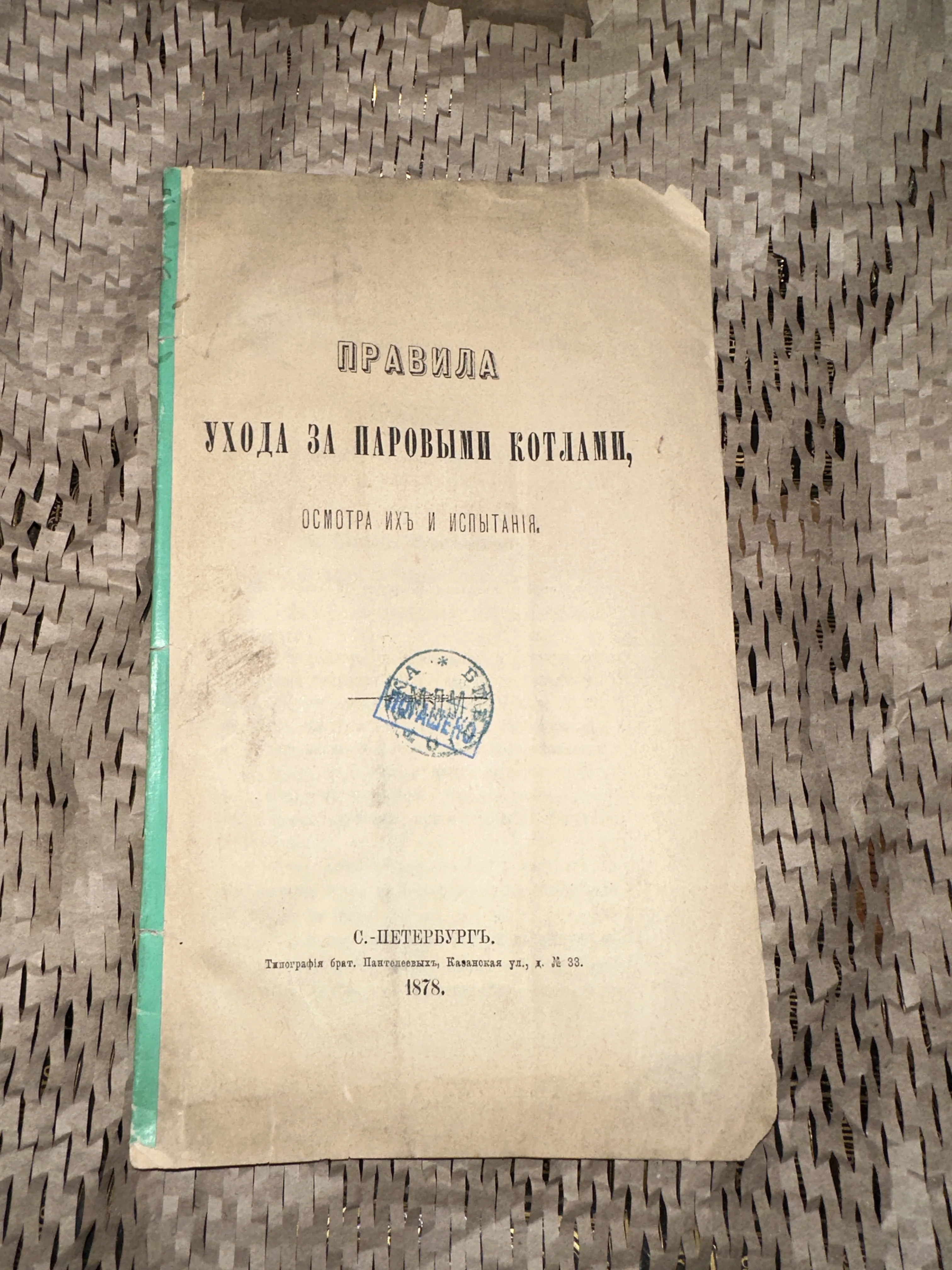 Обложка старинной технической брошюры 1878 года под названием Правила ухода за паровыми котлами, изданной в Санкт-Петербурге.