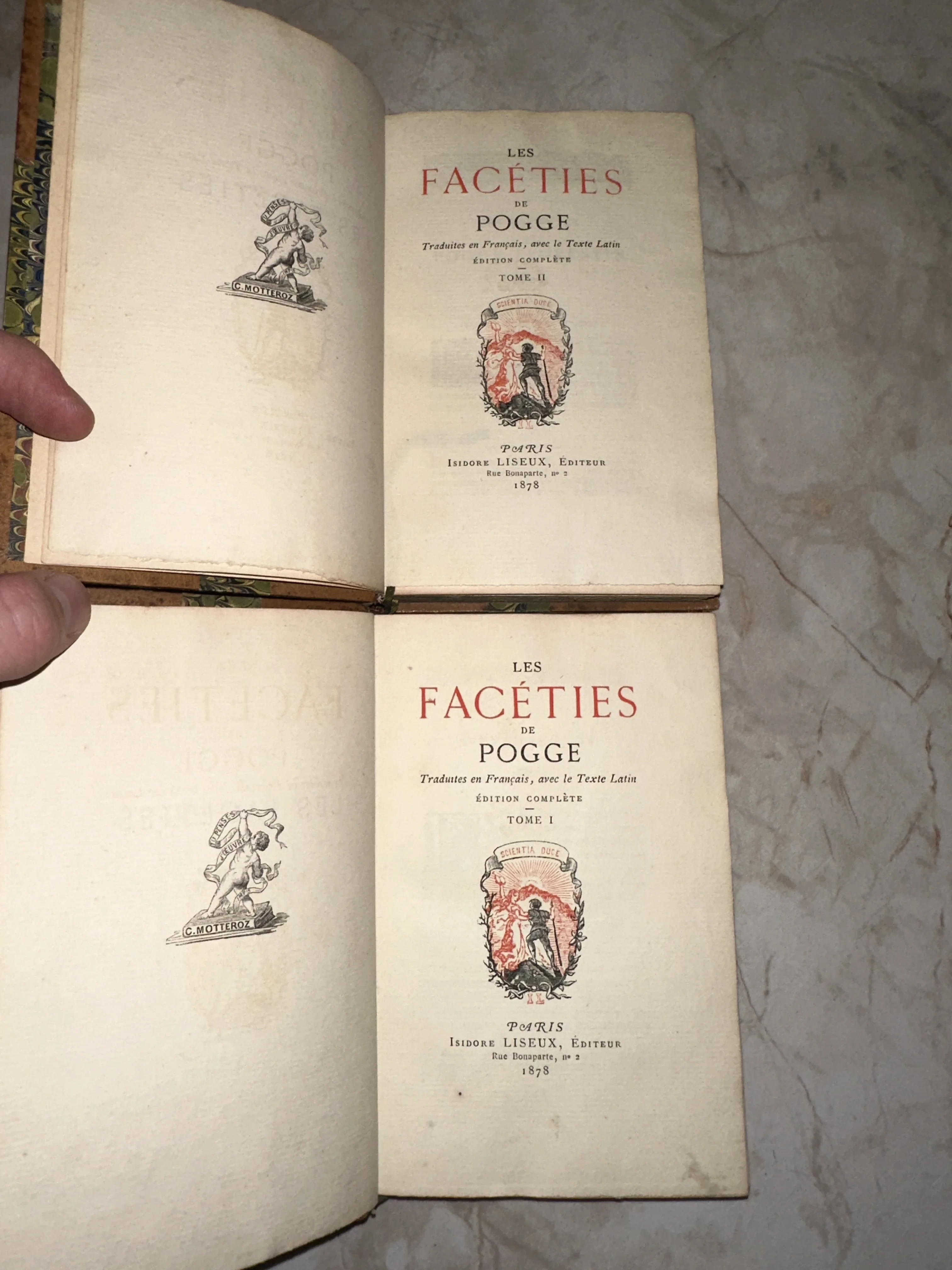 Редкое двухтомное издание «Фацетий» знаменитого гуманиста Поджо Браччолини, выпущенное в Париже издателем Исидором Лизе в 1878 году. Текст представлен параллельно на латыни и французском языке, дополнен изящными гравированными виньетками и сохранил очарование старинной бумаги. Настоящая находка для ценителей европейской сатиры и коллекционеров изысканных малотиражных изданий XIX века.