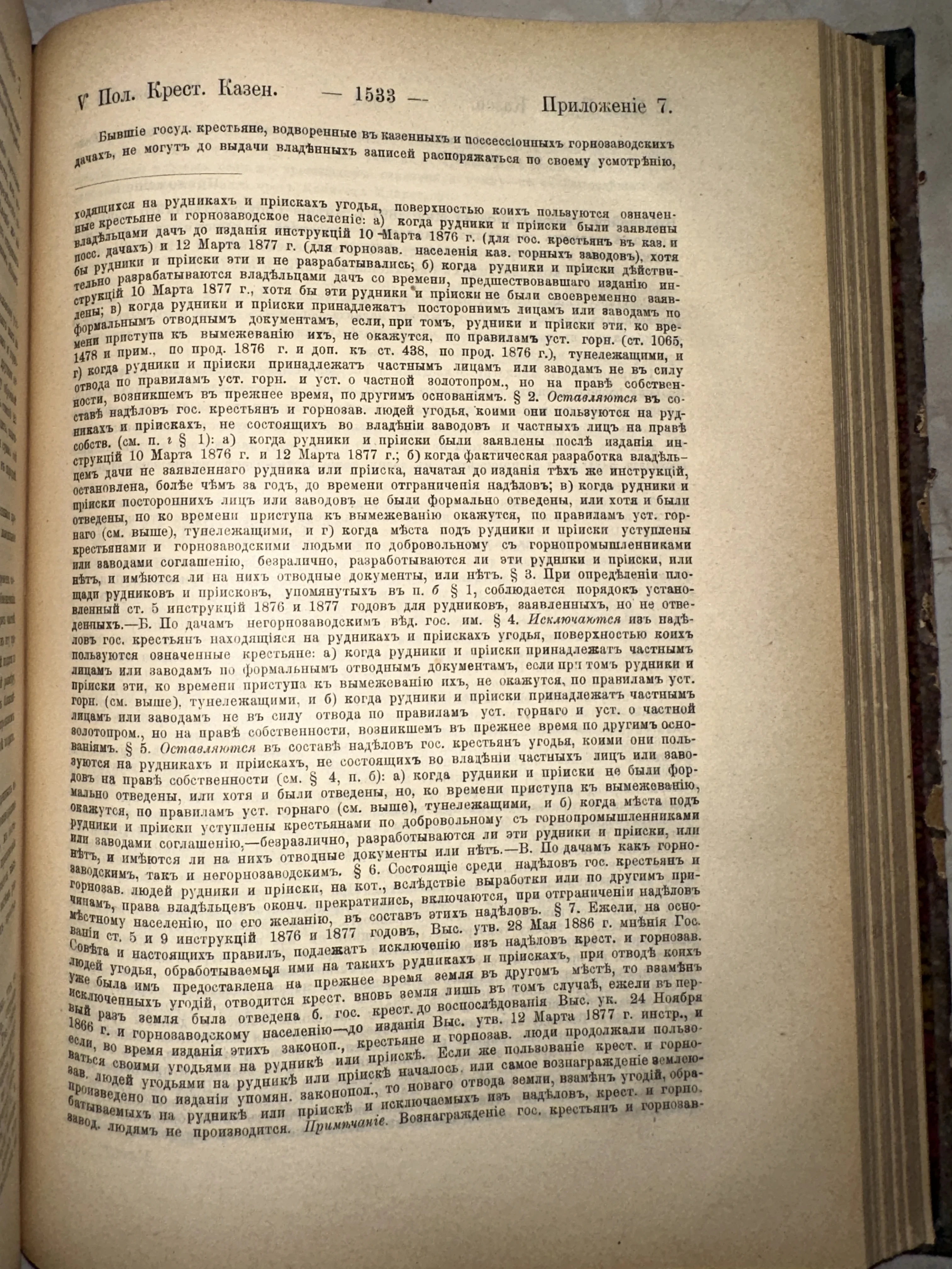 Редкий образец официальной печати конца XIX века, отражающий сложные юридические аспекты земельной реформы в Российской империи. Страница выполнена на плотной бумаге с благородным пожелтением, сохранив четкость классического шрифта и строгую эстетику государственных изданий. Идеальный документ для оформления интерьера или пополнения частной коллекции исторической литературы.