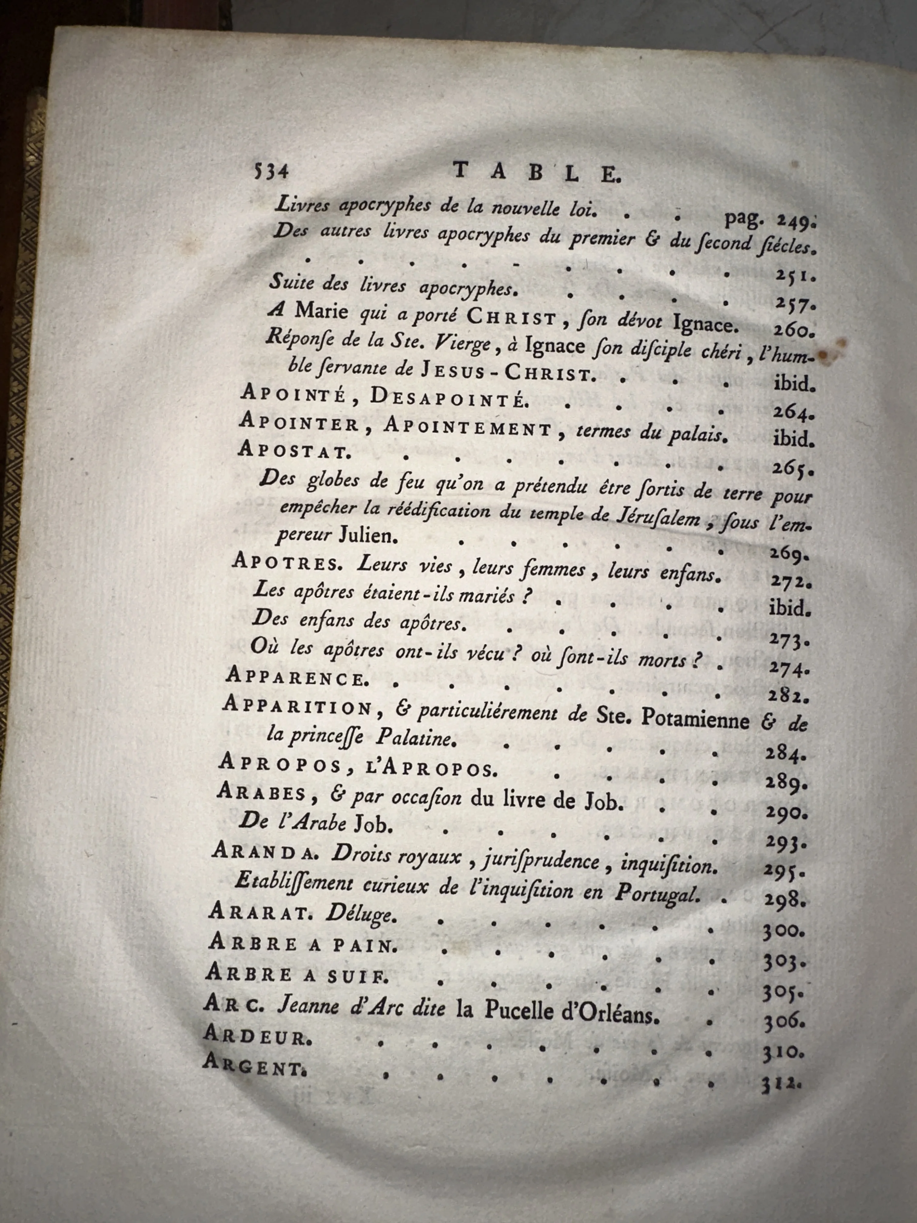Перед вами изящный образец европейской типографики XVIII-XIX веков — страница указателя из редкого французского фолианта. Текст, набранный классическим антиквенным шрифтом, охватывает широкий спектр тем: от апокрифических преданий до истории Жанны д'Арк. Фактурная бумага с легкой благородной патиной подчеркивает почтенный возраст и коллекционную ценность этого документа эпохи Просвещения.