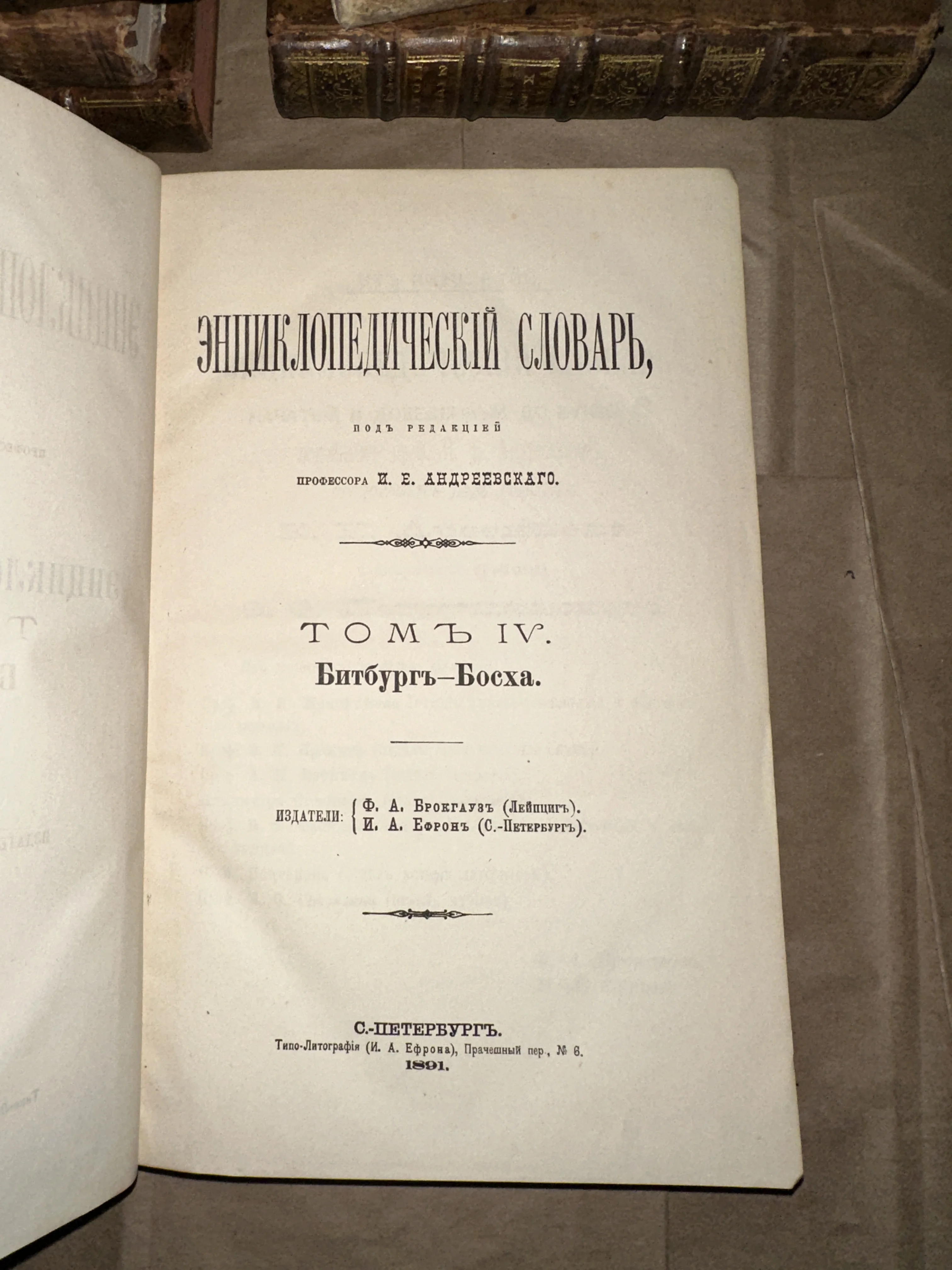 Перед вами титульный лист легендарного издания, ставшего эталоном универсальной энциклопедии Российской империи. Книга сохранила превосходную сохранность бумаги и четкость дореволюционных шрифтов, а на заднем плане видны фрагменты роскошных кожаных корешков с золотым тиснением. Этот том — не просто источник знаний, но и монументальный памятник книгоиздательского искусства конца XIX века.