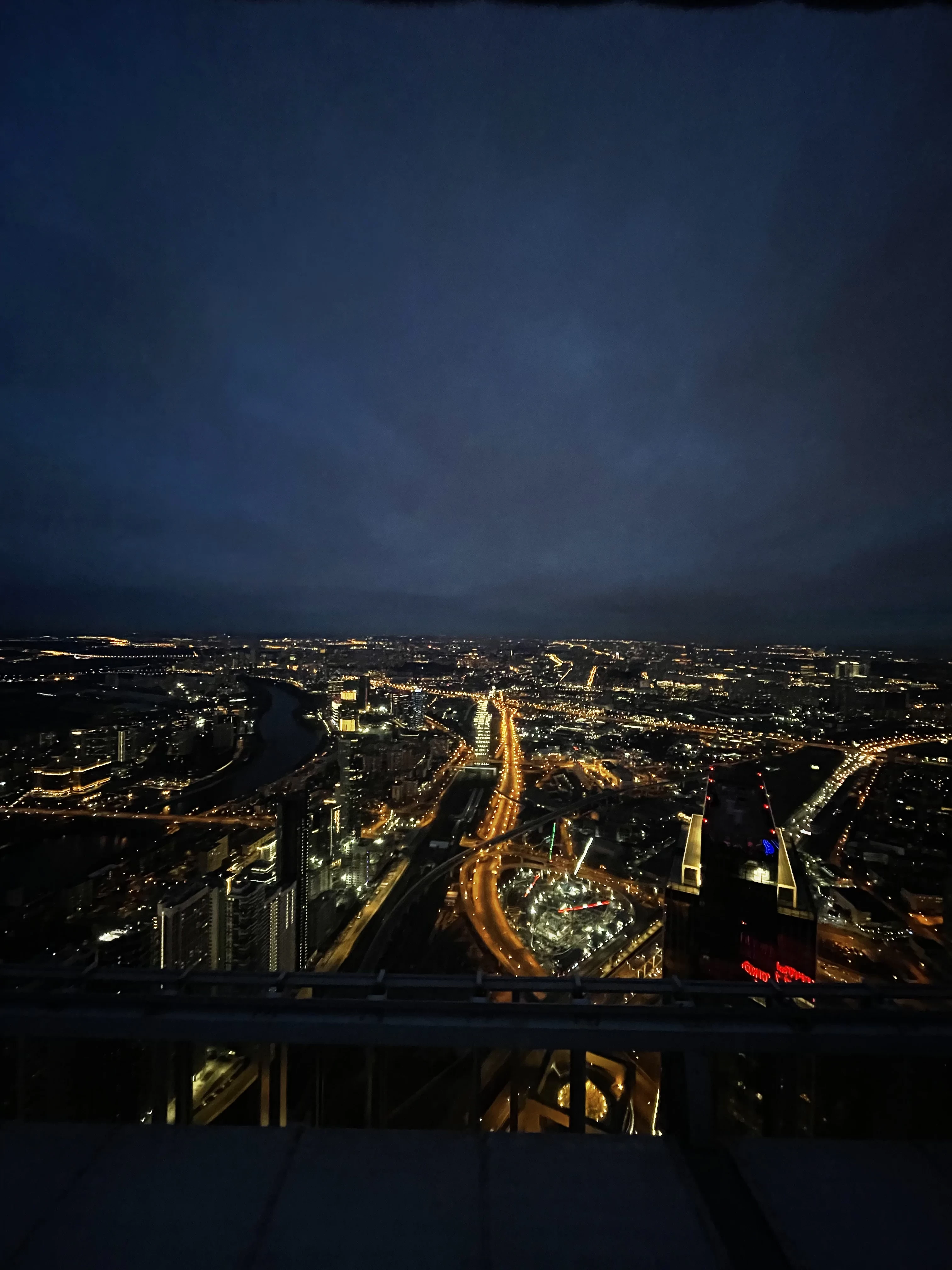 Завораживающий панорамный снимок запечатлел ритм современного мегаполиса, утопающего в золотистых огнях дорожных артерий и ночной иллюминации. Глубокое темное небо создает драматичный контраст с яркой геометрией города, подчеркивая масштаб и технологичное величие архитектуры. Фотография мастерски передает атмосферу бесконечного движения и ночного спокойствия, открывающегося с вершины небоскреба.