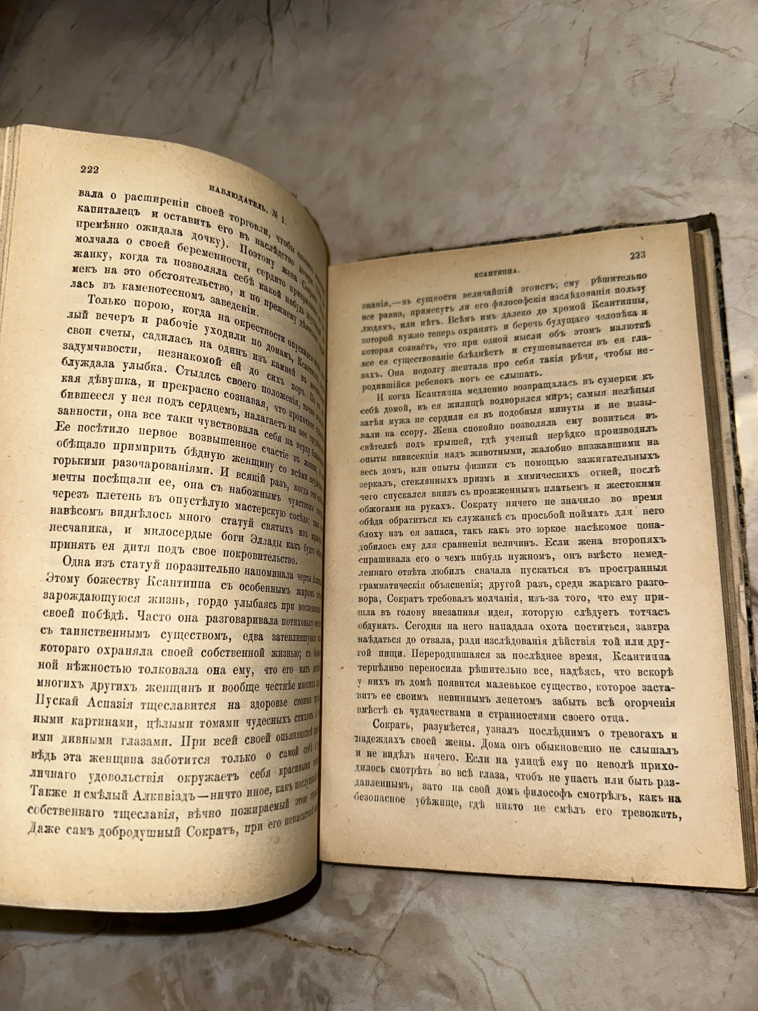 Перед вами подлинный фрагмент истории — разворот литературного журнала «Наблюдатель» с очерком о Ксантиппе и Сократе. Пожелтевшие от времени страницы сохранили исключительную четкость дореволюционного шрифта, передавая неповторимую атмосферу интеллектуальных чтений конца XIX столетия. Идеальный образец для пополнения коллекции редкой периодики или оформления классического интерьера.