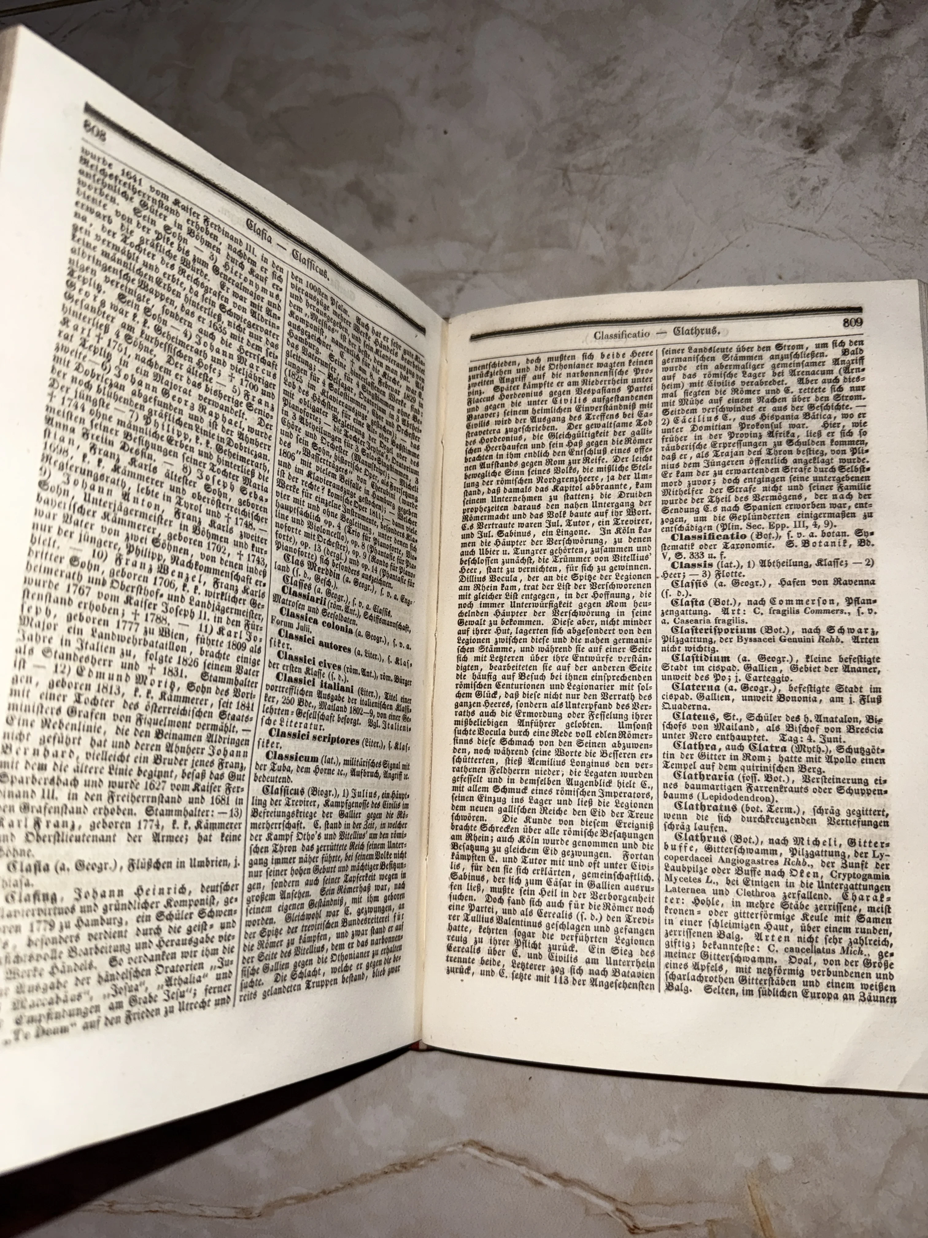 Перед вами подлинный фрагмент истории — разворот энциклопедического издания с характерным готическим начертанием букв. Благородная патина времени на бумаге и плотная верстка в две колонки передают аутентичную атмосферу европейской научной мысли прошлого. Идеальный экземпляр для ценителей редкой букинистики и книжного искусства XIX века.