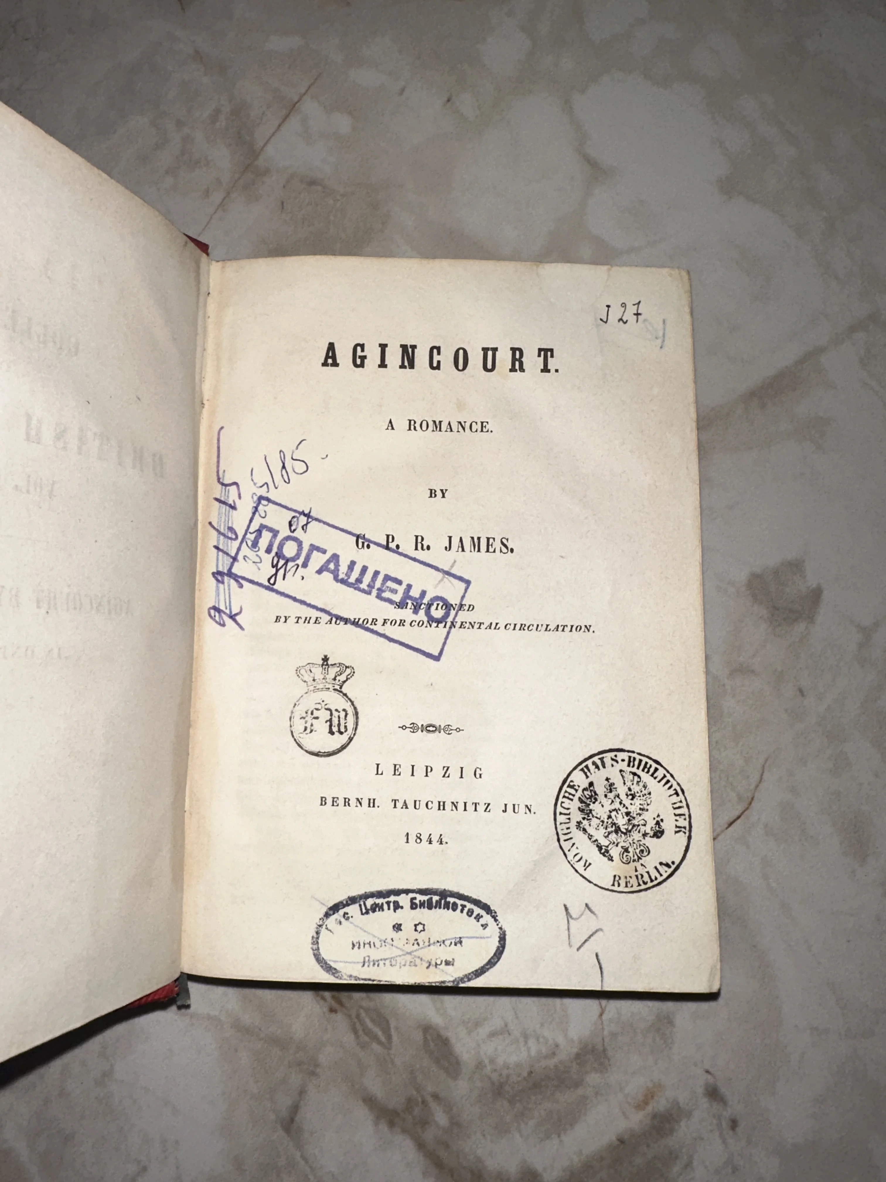 Титульный лист антикварной книги Agincourt автора G. P. R. James, изданной в Лейпциге в 1844 году, с печатями Королевской библиотеки Берлина и советскими библиотечными штампами.
