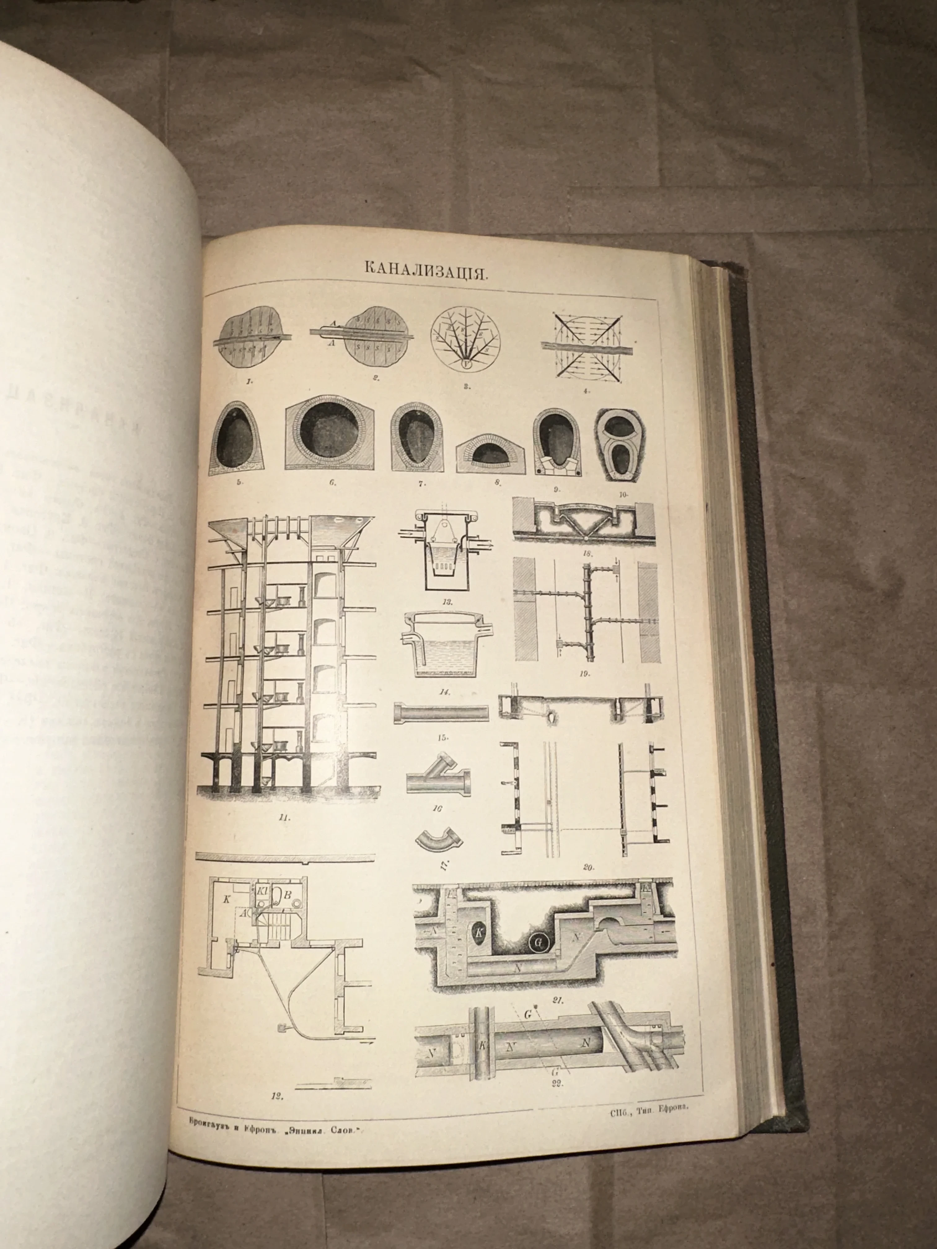 Уникальный образец инженерной графики из легендарного Энциклопедического словаря Брокгауза и Ефрона. На странице представлены детальные схемы городского благоустройства и сечения труб, выполненные с высочайшей точностью, что делает этот экземпляр ценным артефактом истории науки и техники.