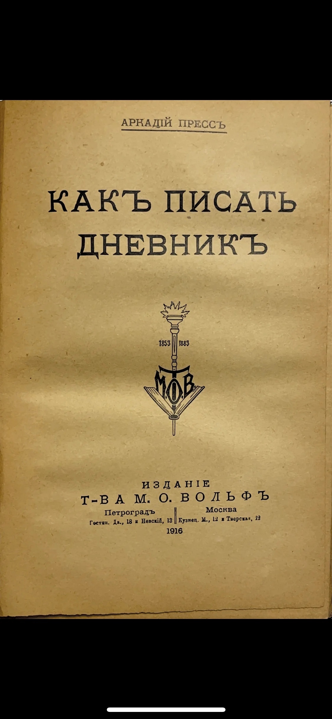 Титульный лист антикварной книги Аркадия Пресса «Как писать дневник», изданной товариществом М. О. Вольфа в 1916 году.