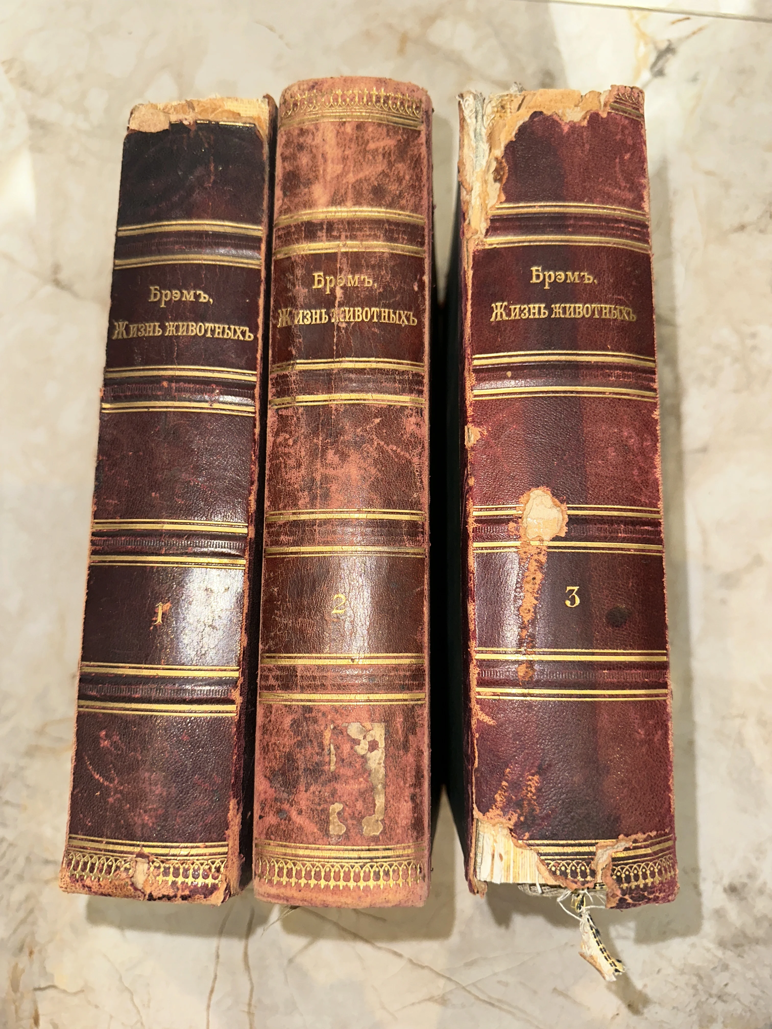 Три антикварных тома книги Альфреда Брема «Жизнь животных» с кожаными корешками и золотым тиснением.