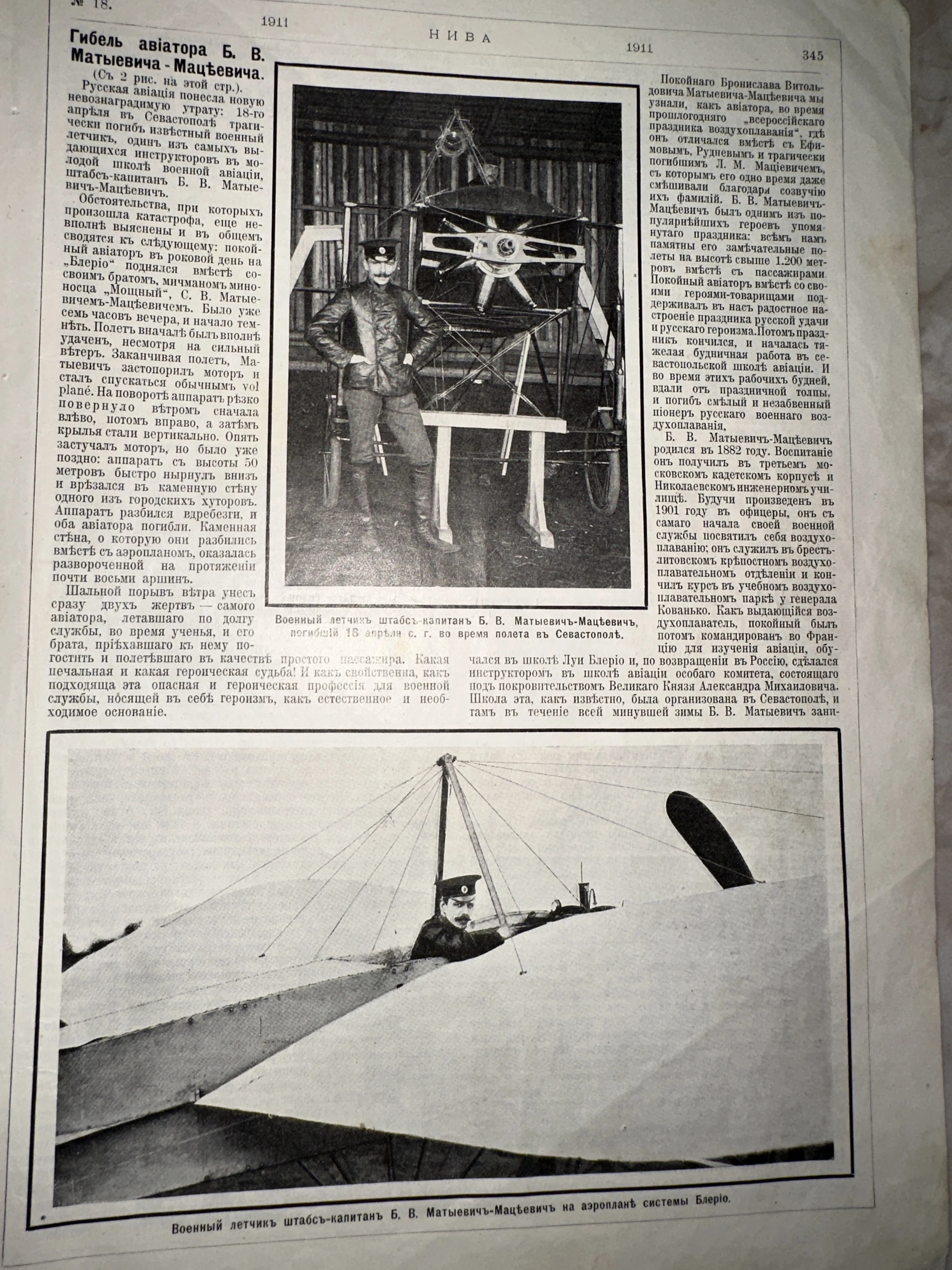 Подлинный фрагмент истории ранней русской авиации на страницах знаменитого журнала «Нива». На пожелтевшей от времени бумаге запечатлены редкие снимки штабс-капитана Матыевича-Мацеевича и подробный отчет о трагедии в Севастополе. Этот документ станет ценным дополнением коллекции по истории техники и воздухоплавания Российской Империи.