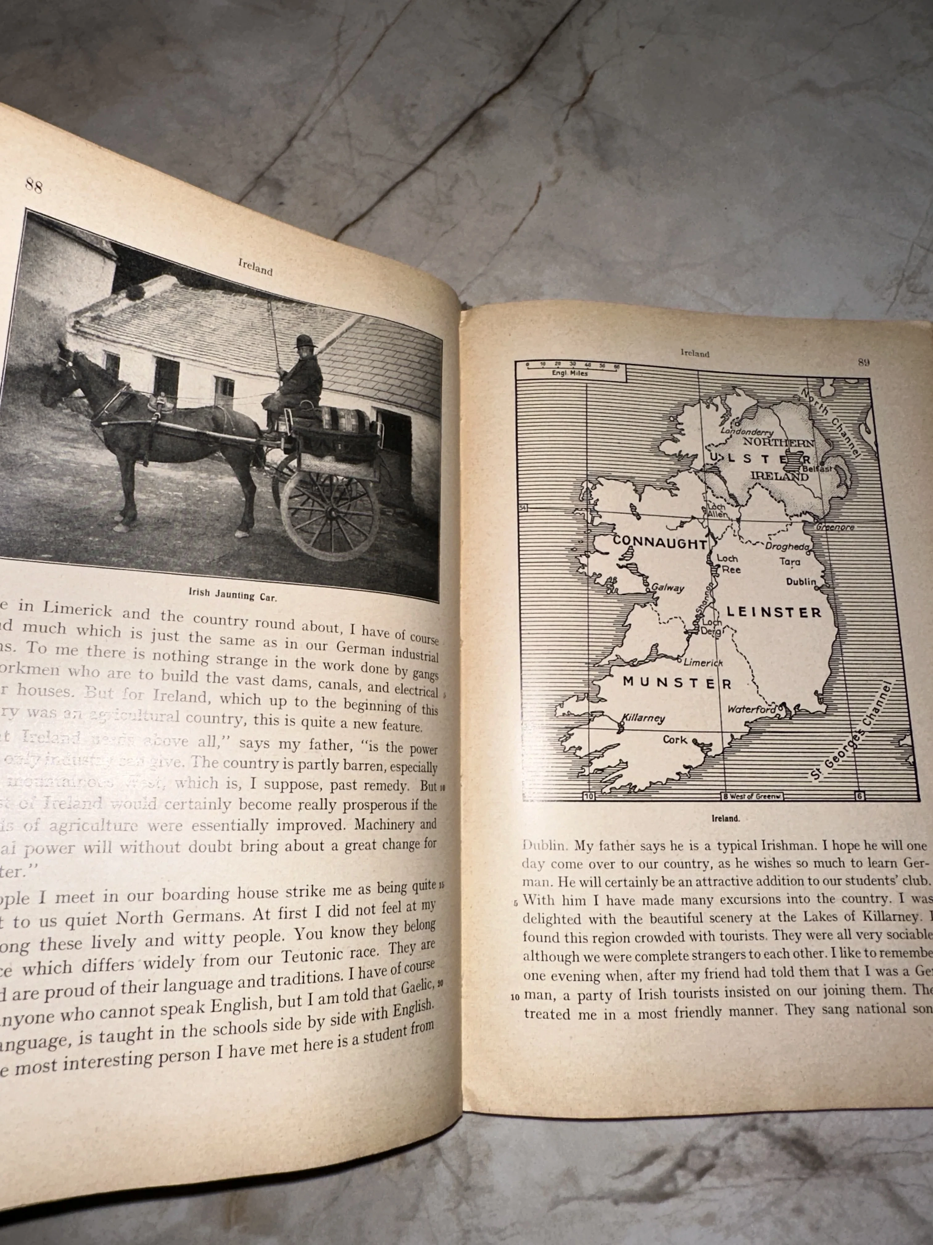 Перед вами редкий разворот антикварного издания, посвященного Ирландии, с аутентичной черно-белой фотографией традиционной повозки и подробной картой регионов. Страницы сохранили приятный кремовый оттенок старины и четкость классической типографской печати. Этот экземпляр станет ценным приобретением для коллекционеров исторической литературы и любителей кельтской культуры.