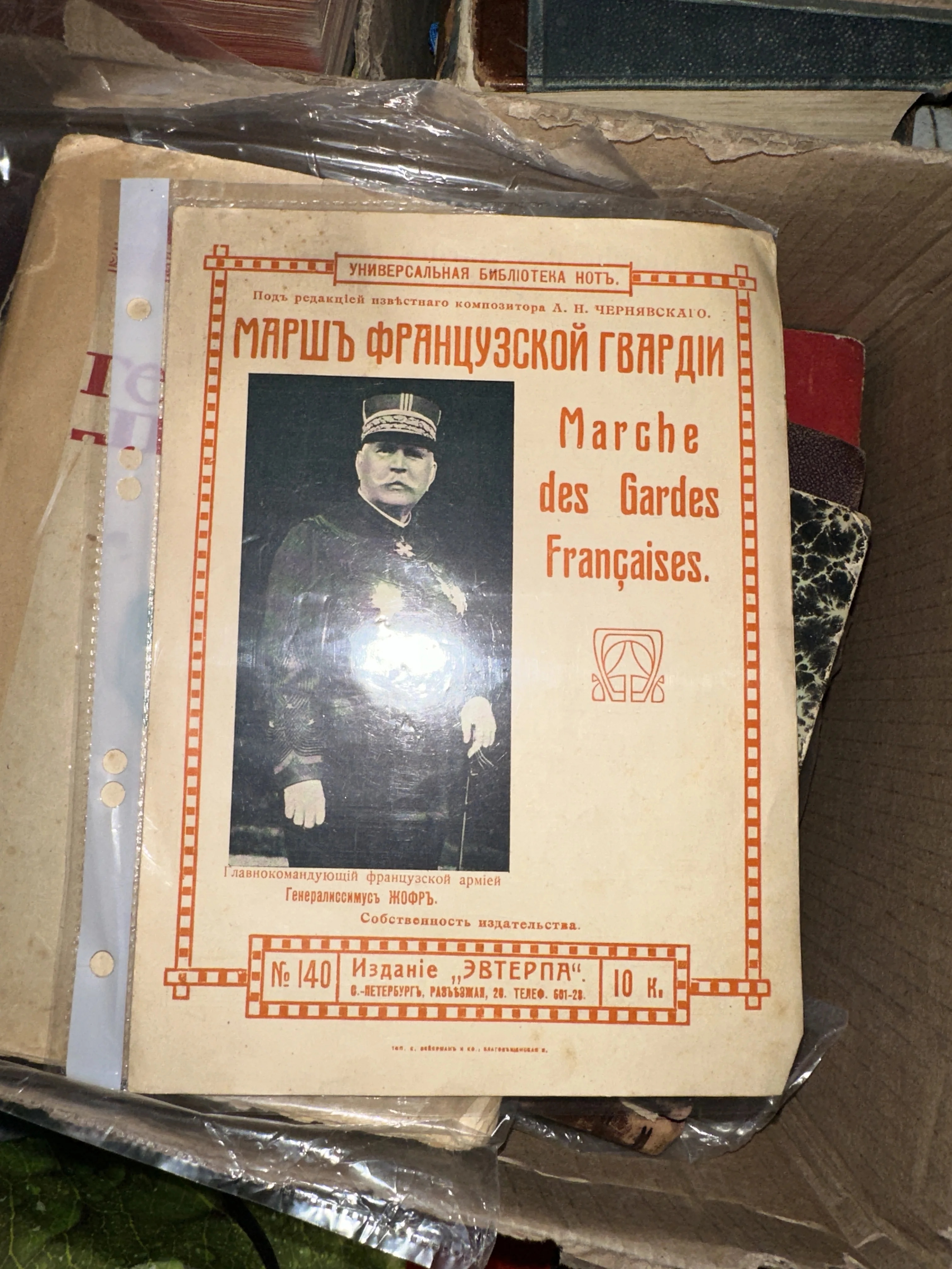 Редкое дореволюционное издание из серии «Универсальная библиотека нот», выпущенное в Санкт-Петербурге. Обложка украшена портретом главнокомандующего французской армией генерала Жоффра, что делает этот экземпляр ценным свидетельством эпохи Первой мировой войны. Состояние бумаги передает подлинную атмосферу старины, сохраняя четкость типографских шрифтов и графики начала XX века.