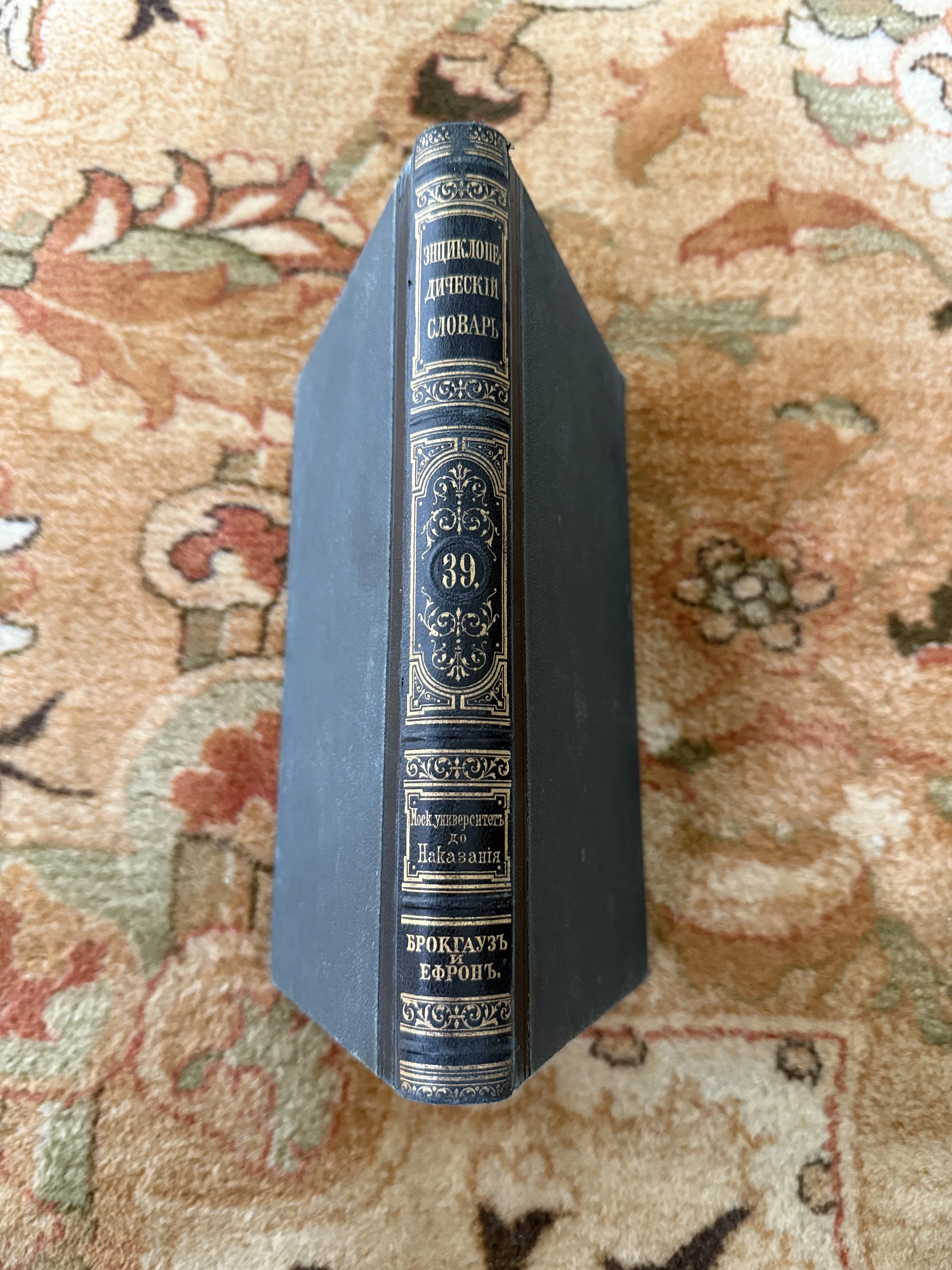 Роскошный корешок 39-го тома легендарной энциклопедии с детальным золотым тиснением и классическими виньетками. Издание охватывает темы от Московского университета до Наказания, представляя собой не только источник знаний, но и великолепный образец переплетного искусства рубежа веков. Состояние переплета подчеркивает благородный возраст и коллекционную ценность экземпляра.