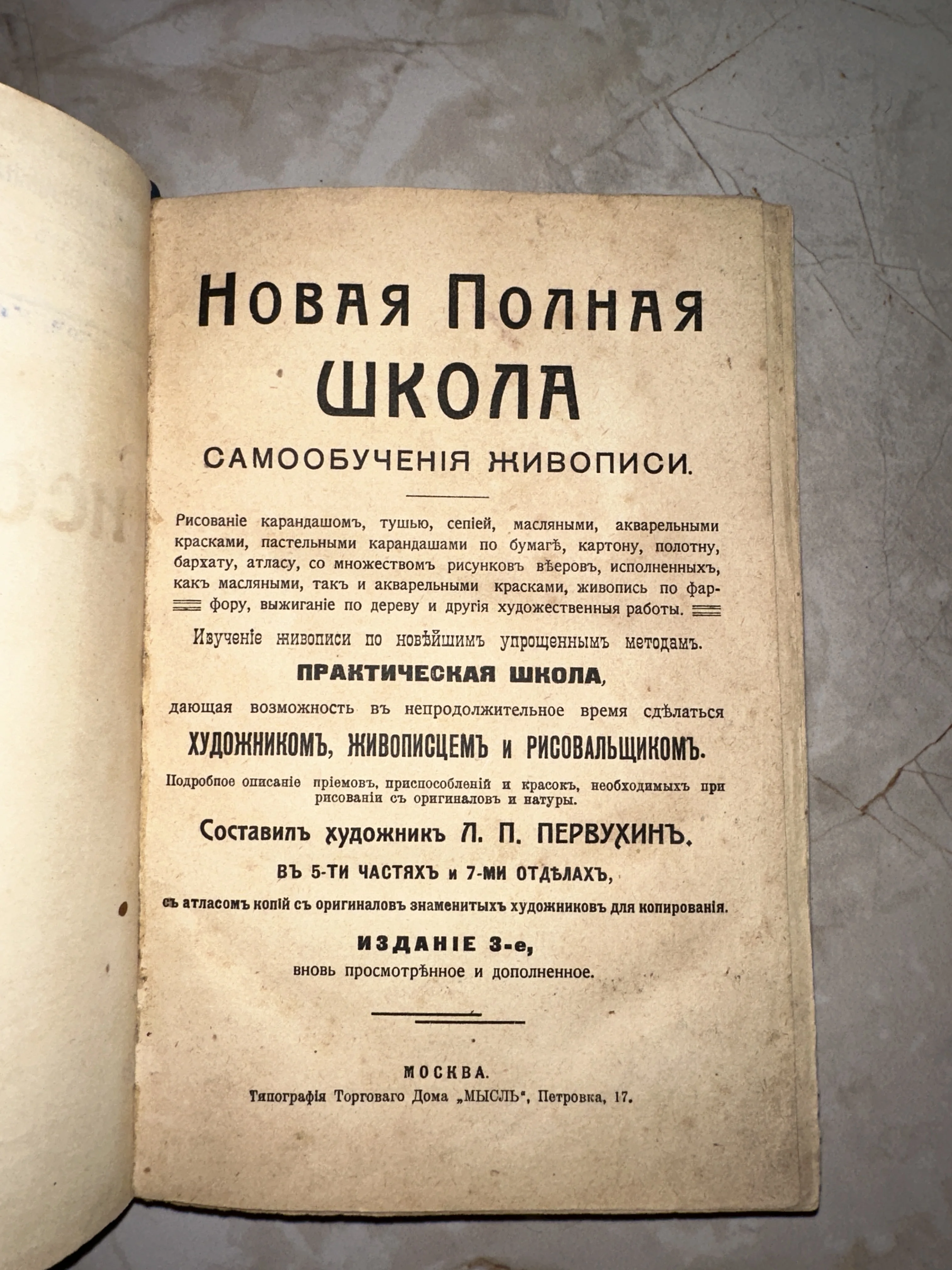 Титульный лист старинной книги Л. П. Первухина «Новая Полная Школа Самообученія Живописи», изданной в Москве в типографии «Мысль».