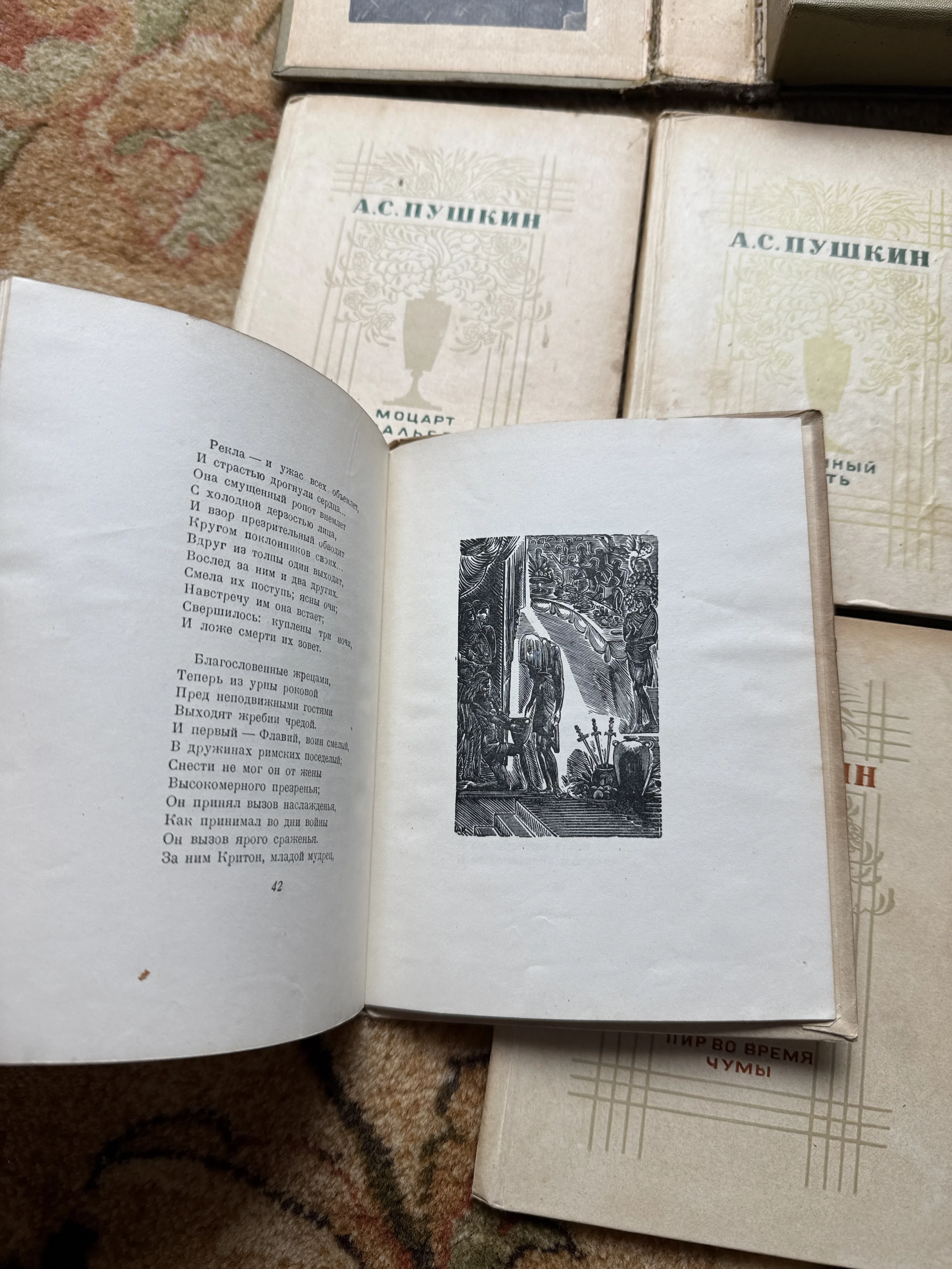 Раскрытая старая книга А. С. Пушкина с черно-белой иллюстрацией-гравюрой и текстом стихотворения на фоне других томов серии.