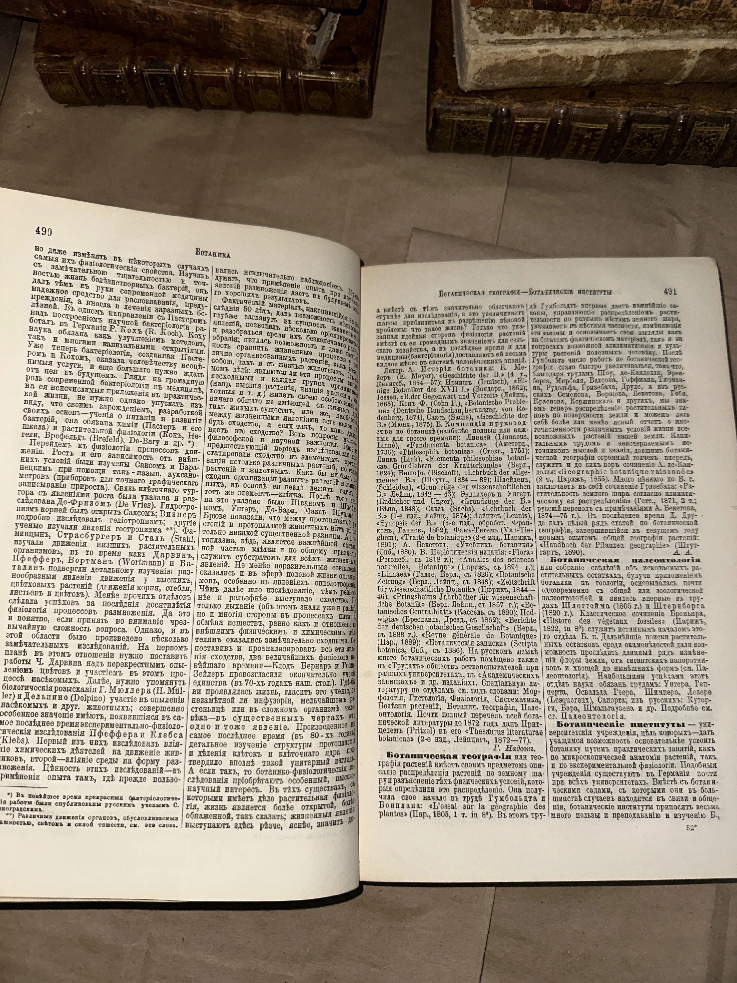 Раскрытая антикварная книга со статьями по ботанике на дореволюционном русском языке, страницы 490 и 491.