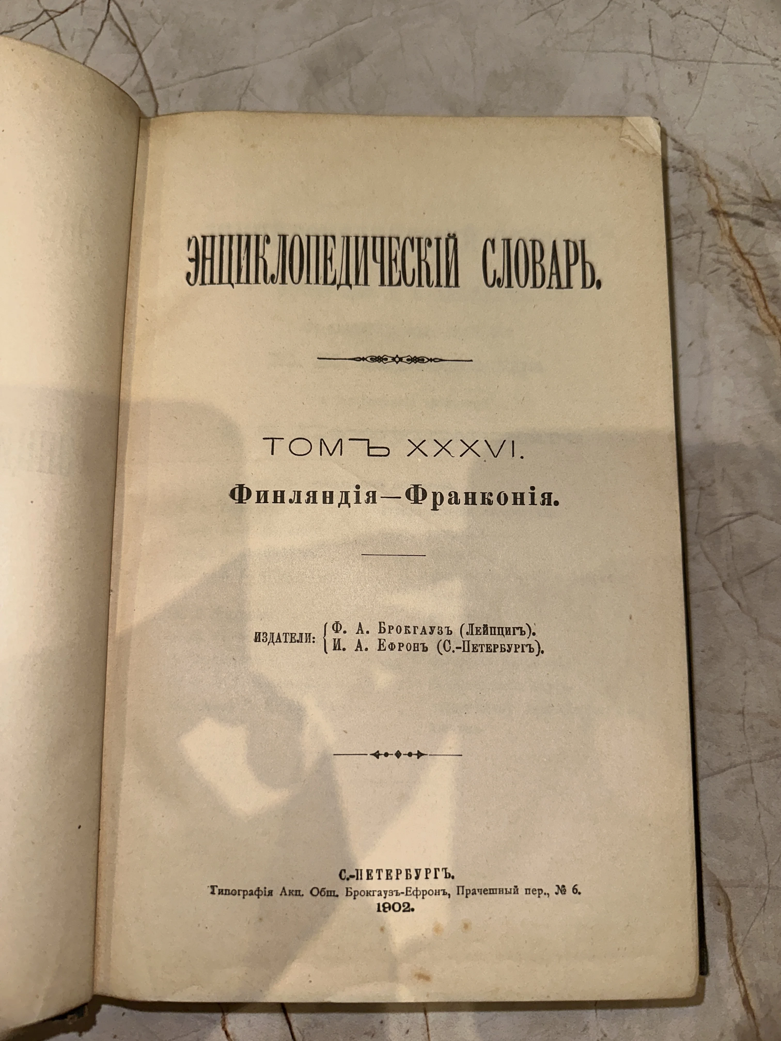 Титульный лист 36-го тома антикварного Энциклопедического словаря Брокгауза и Ефрона, изданного в Санкт-Петербурге в 1902 году.