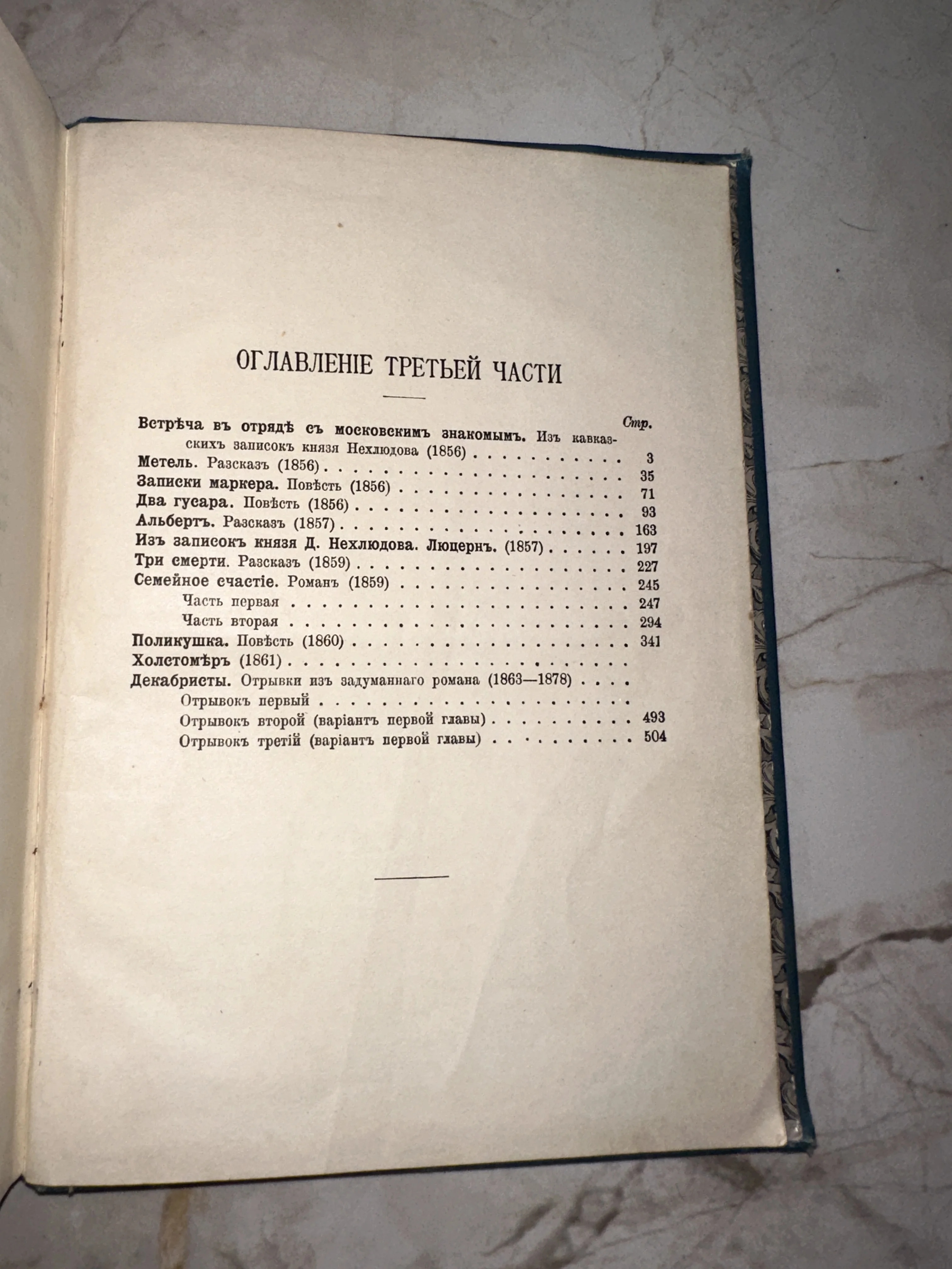 Фотография страницы старинной книги с оглавлением произведений Льва Толстого, напечатанным в дореволюционной орфографии.