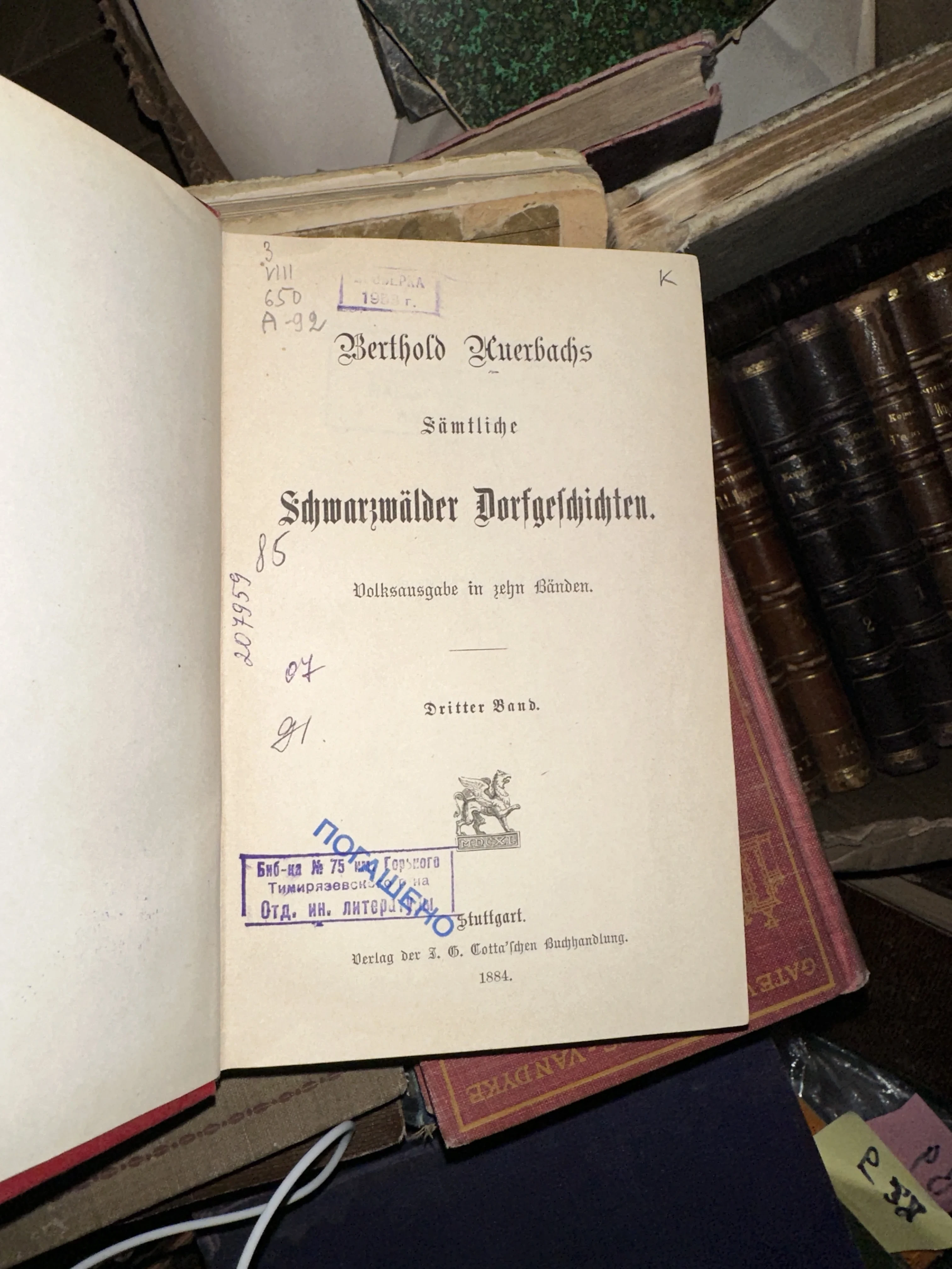 Титульный лист антикварной книги Бертольда Ауэрбаха на немецком языке с библиотечными штампами и готическим шрифтом.