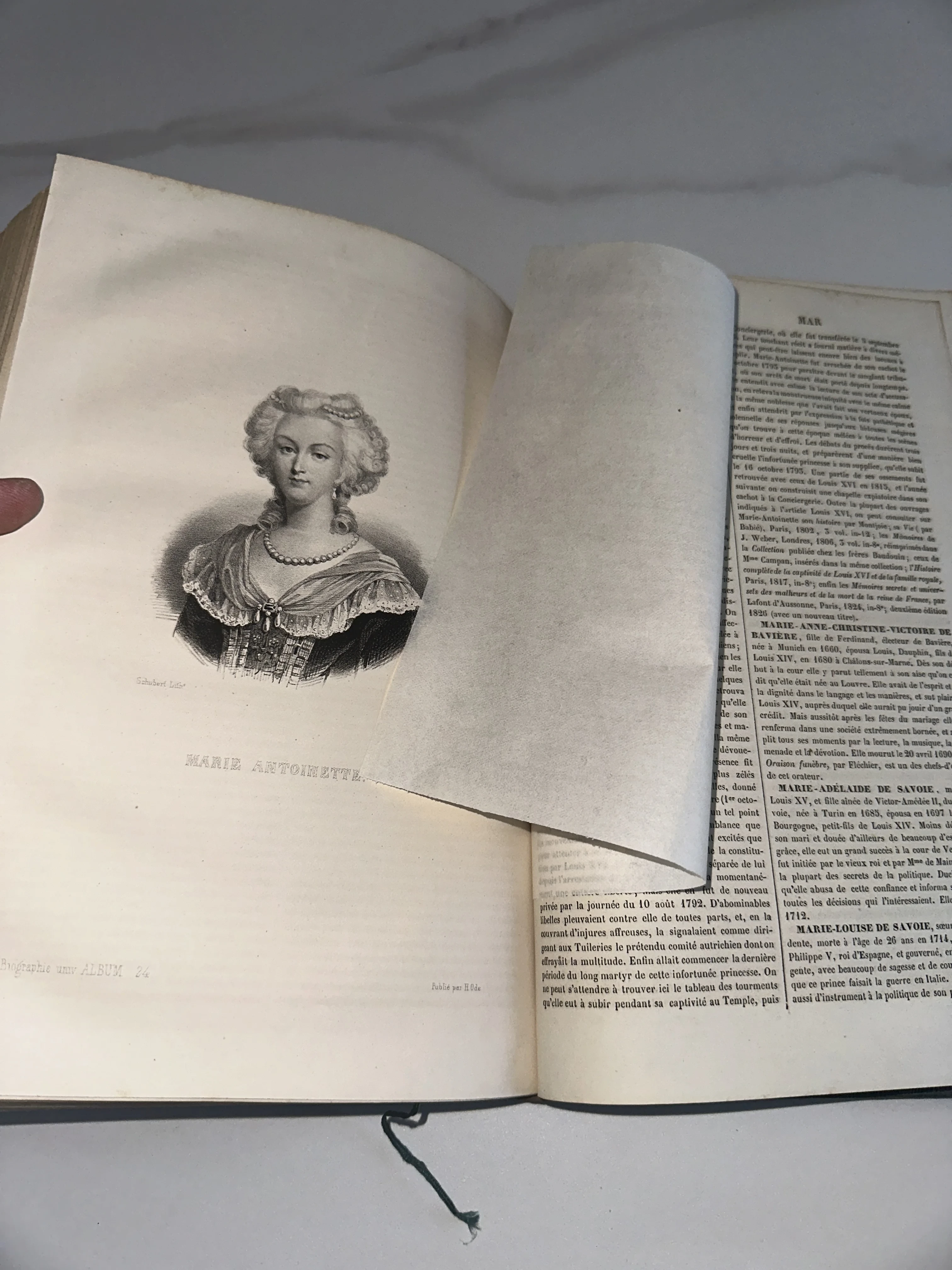 Изящная литография Шуберта из биографического альбома XIX века, запечатлевшая величественный образ французской королевы. Страницы обладают благородным оттенком слоновой кости, а сохранившаяся защитная калька подчеркивает коллекционную ценность предмета. Текст на французском языке и детальная проработка гравюры создают атмосферу подлинной исторической реликвии.