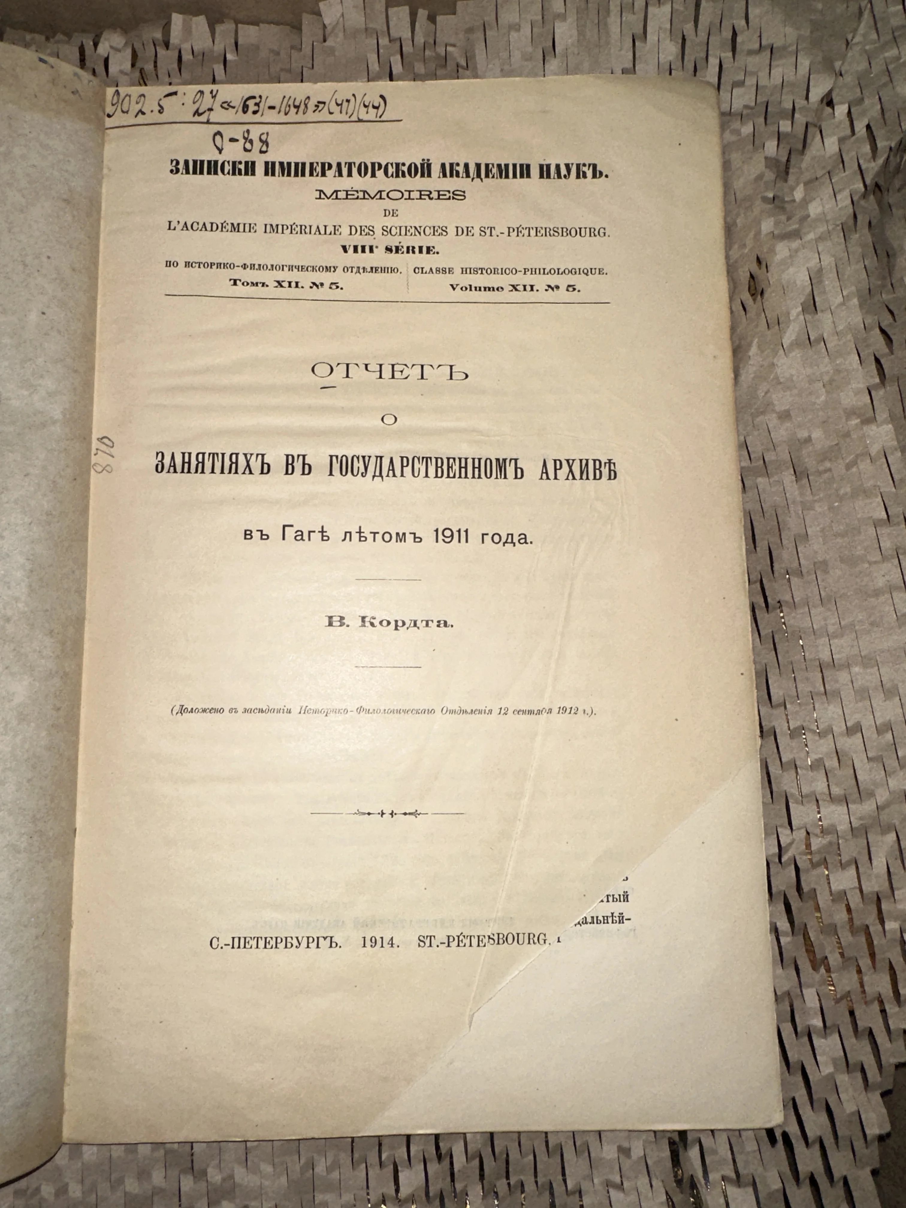 Перед вами подлинный образец научной мысли начала XX столетия — отчет В. Кордта о работе в Государственном архиве Гааги, изданный под эгидой Императорской Академии наук. Страницы из плотной бумаги сохранили легкий оттенок слоновой кости и аутентичные архивные пометы, свидетельствующие о богатом прошлом экземпляра. Это издание станет ценным приобретением для коллекционеров академической литературы и исследователей истории международных отношений.