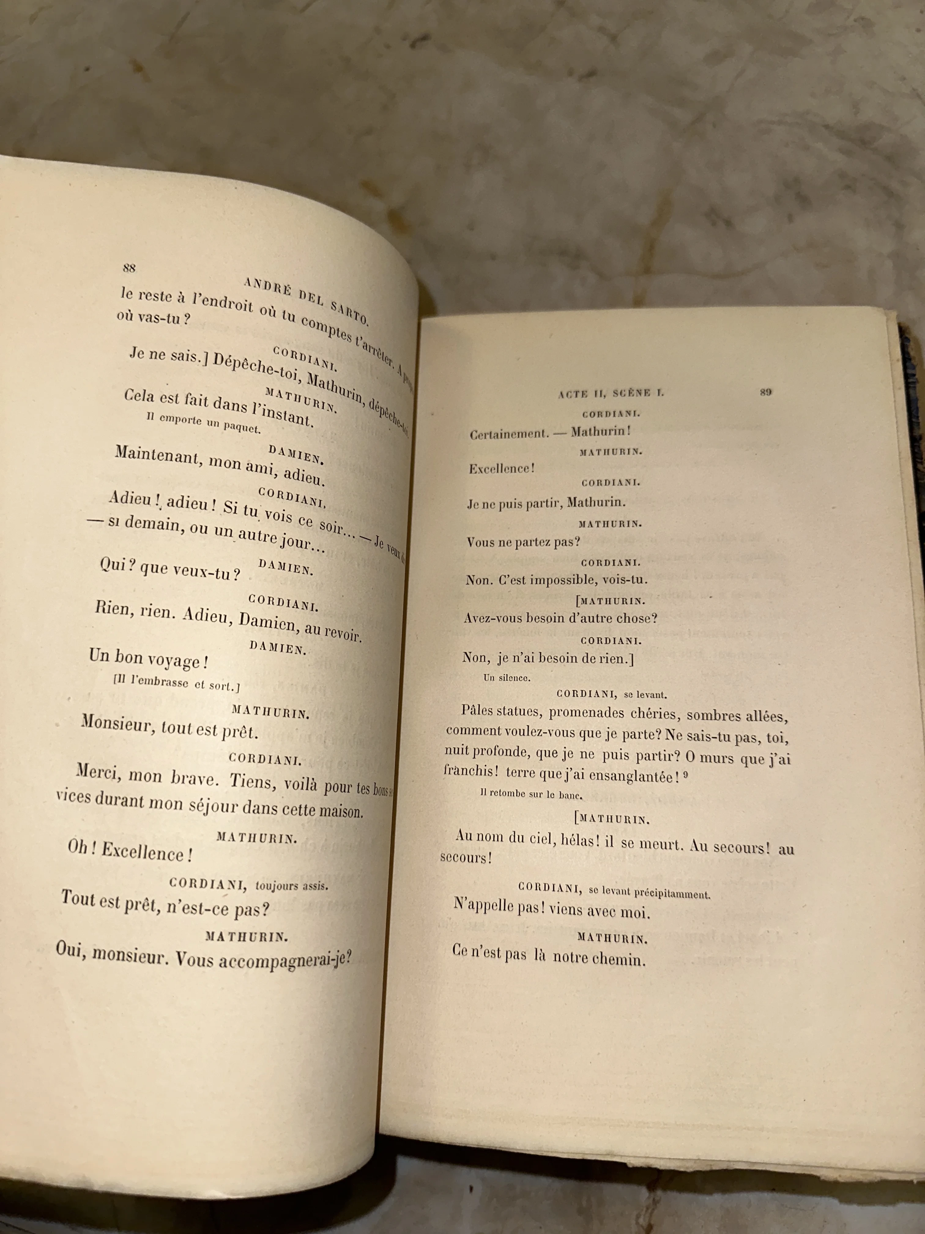 Разворот старинной книги с французским текстом пьесы Андре дель Сарто, страницы 88 и 89.
