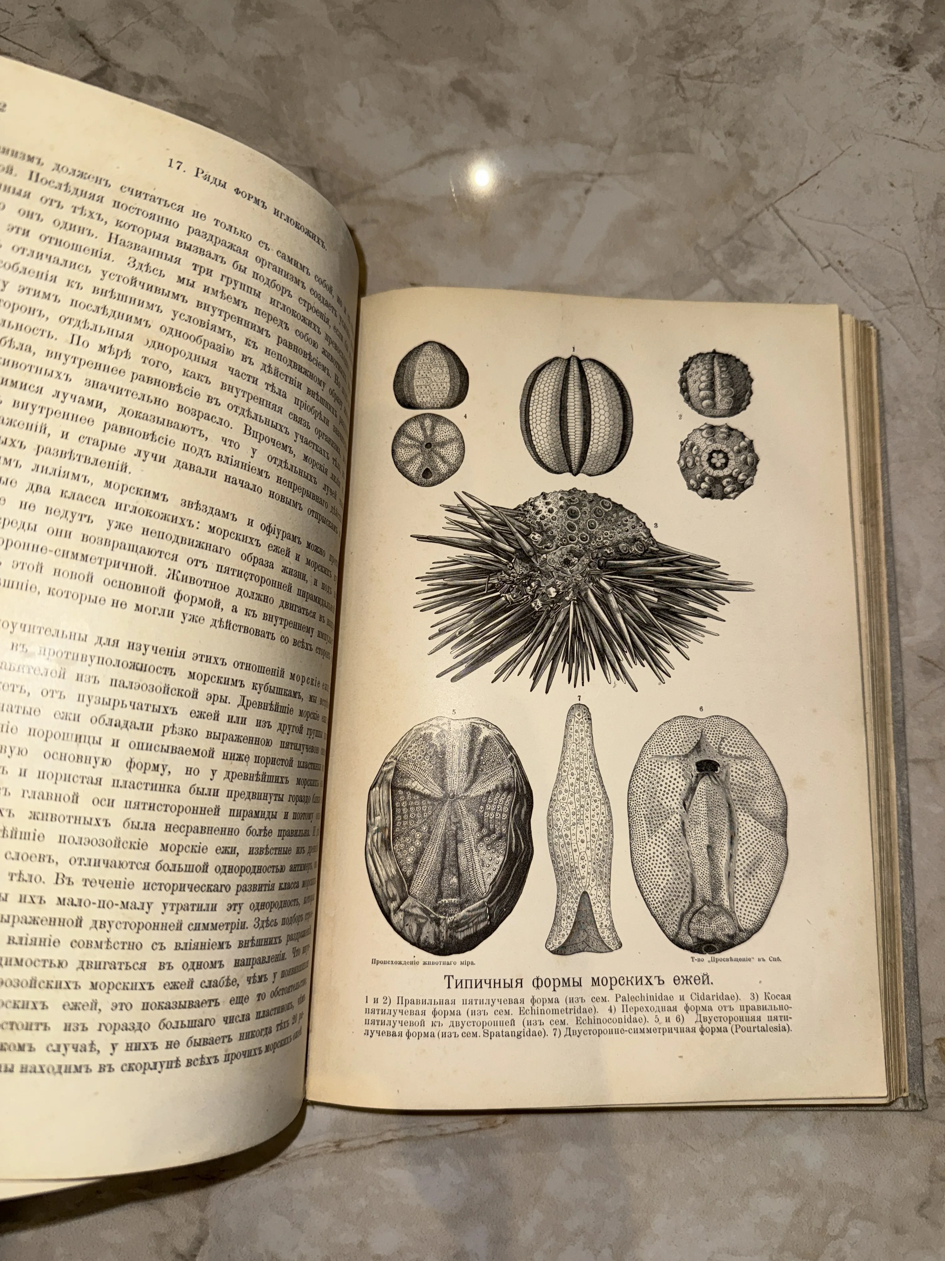 Изысканный образец научной графики из фундаментального труда по естествознанию начала XX века. Детализированные изображения морских ежей и их панцирей выполнены с поразительной точностью, передающей всю сложность природных форм. Страницы с легким налетом патины времени и дореформенный шрифт подчеркивают коллекционную ценность этого антикварного издания.