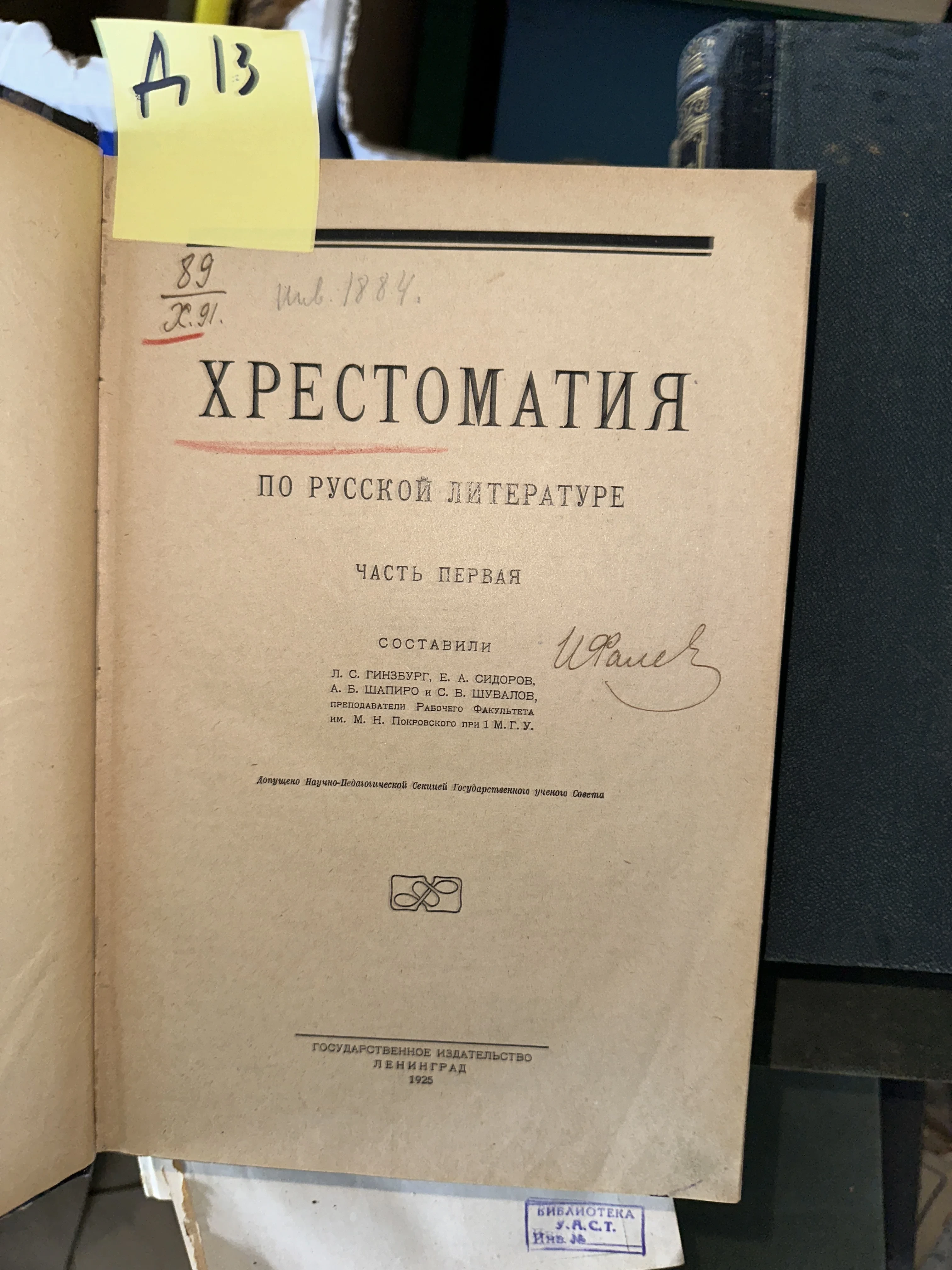 Титульный лист советского учебного издания 1925 года «Хрестоматия по русской литературе» с библиотечными штампами и рукописными пометками.