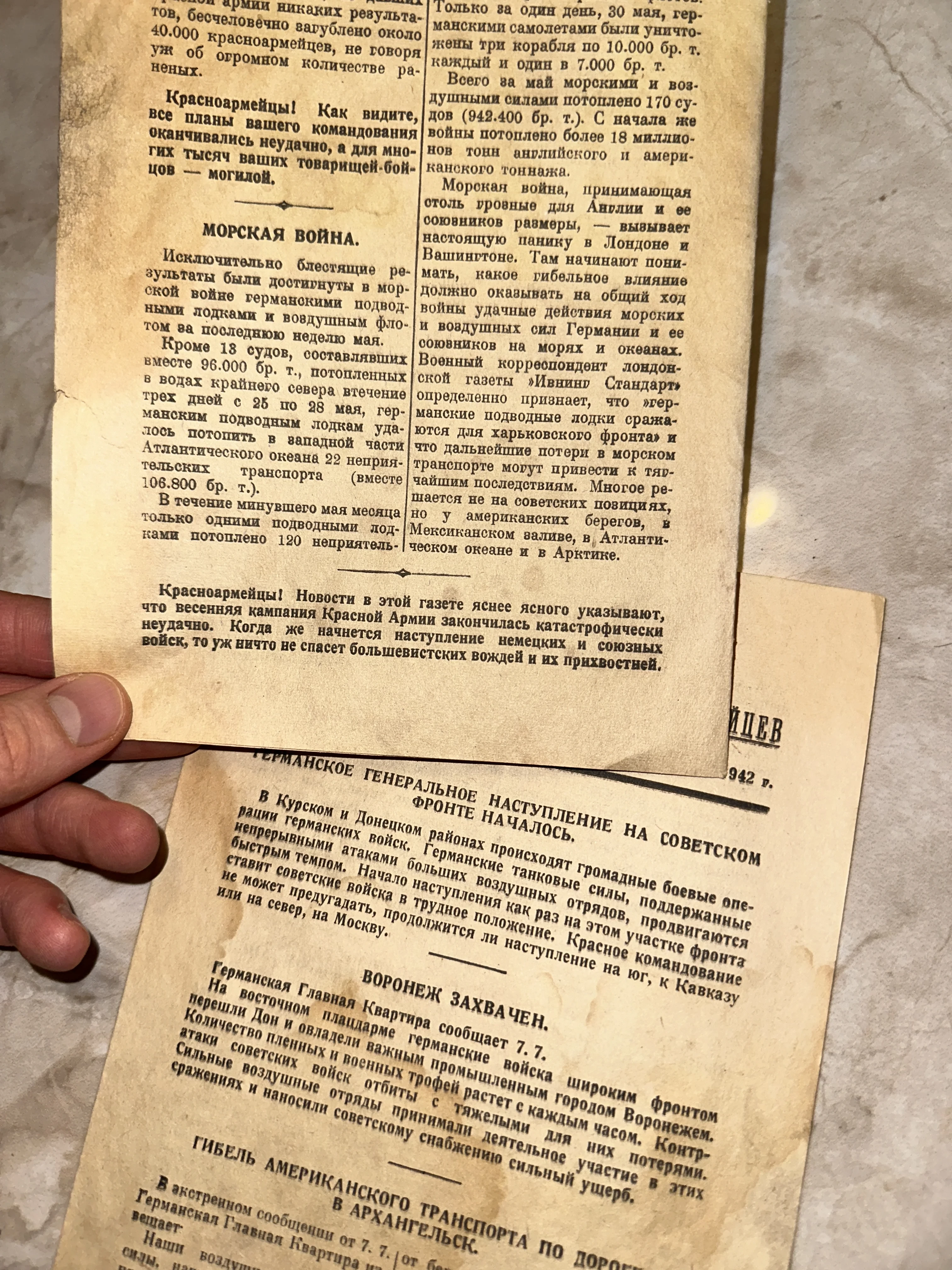 Уникальные подлинные образцы фронтовой пропаганды, напечатанные на тонкой газетной бумаге в период 1942 года. Тексты содержат сводки о морских сражениях и наступлении на Воронеж, представляя собой ценный исторический документ и свидетель эпохи. Артефакты сохранили четкость шрифта и характерную патину времени, что делает их исключительным приобретением для коллекционеров милитарии.