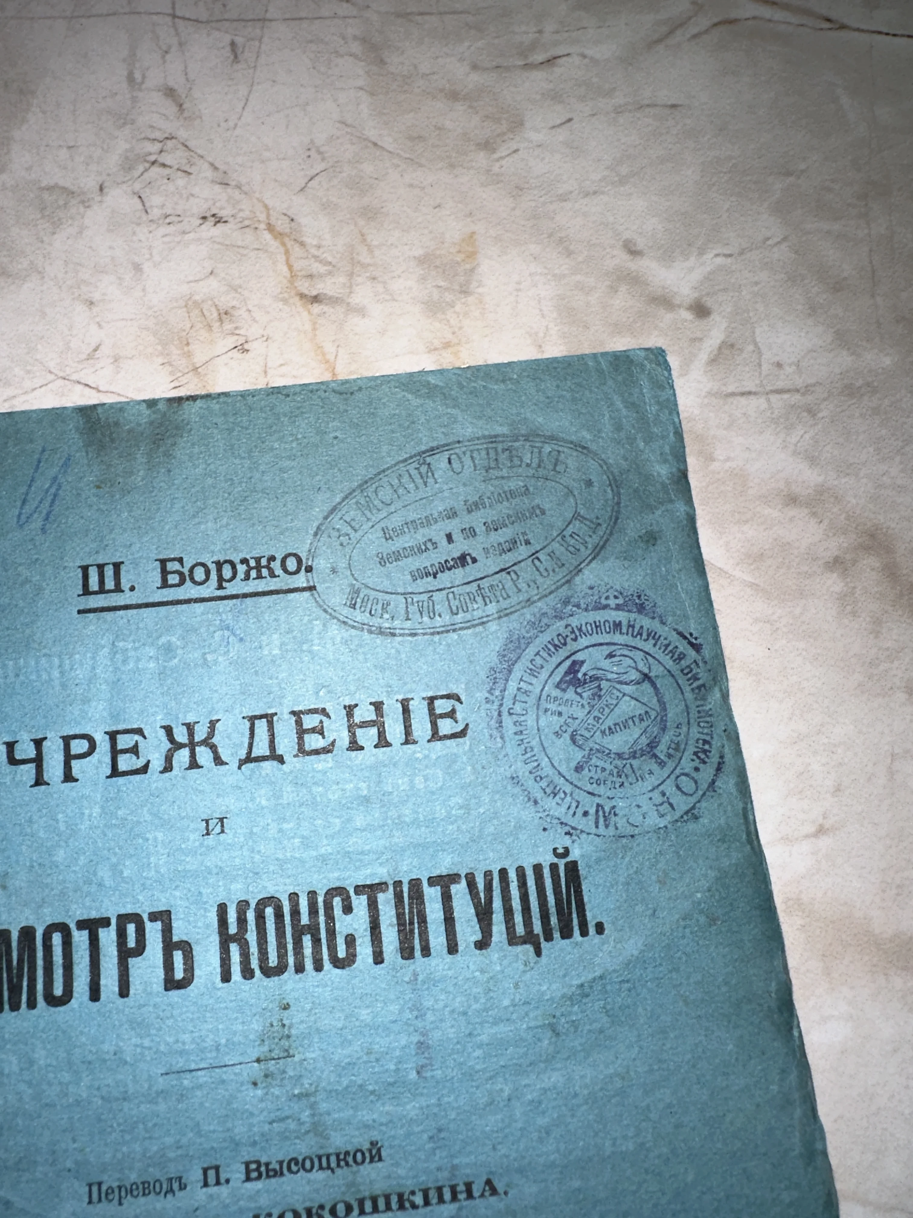 Редкий экземпляр фундаментального труда Шарля Боржо в оригинальной бумажной обложке, сохранившей подлинные штампы Центральной библиотеки Земских изданий. Издание представляет собой уникальный исторический документ с выразительной патиной времени, подчеркивающей преемственность юридической мысли и архивную ценность книги. Идеальный выбор для коллекционеров юридической литературы и исследователей истории государственных институтов.